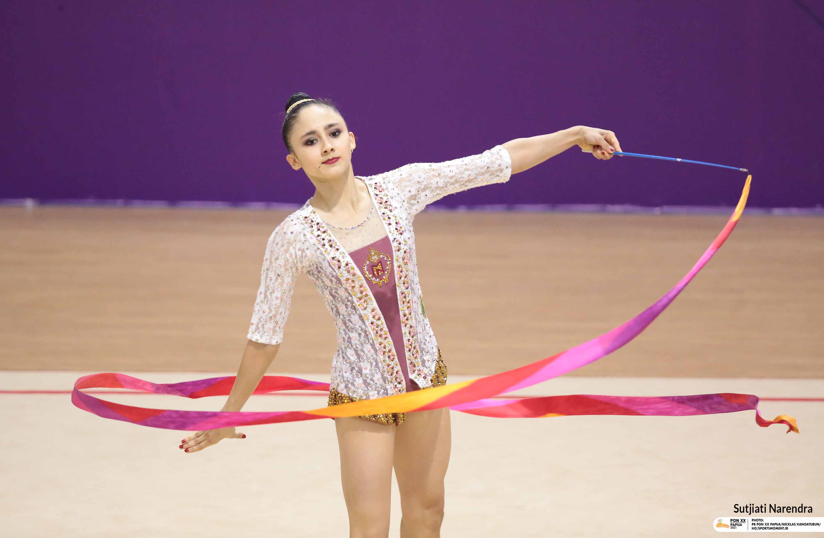 Aksi pesenam Lampung, Sutjiati Narendra saat tampil pada kualifikasi dan final perorangan serba bisa nomor Pita di Istora Papua Bangkit, Sentani, Kabupaten Jayapura, Jumat (08/10/2021). ((Photo: PB PON XX PAPUA/Nicklas Hanoatubun/HO/Sportsmoment.id)