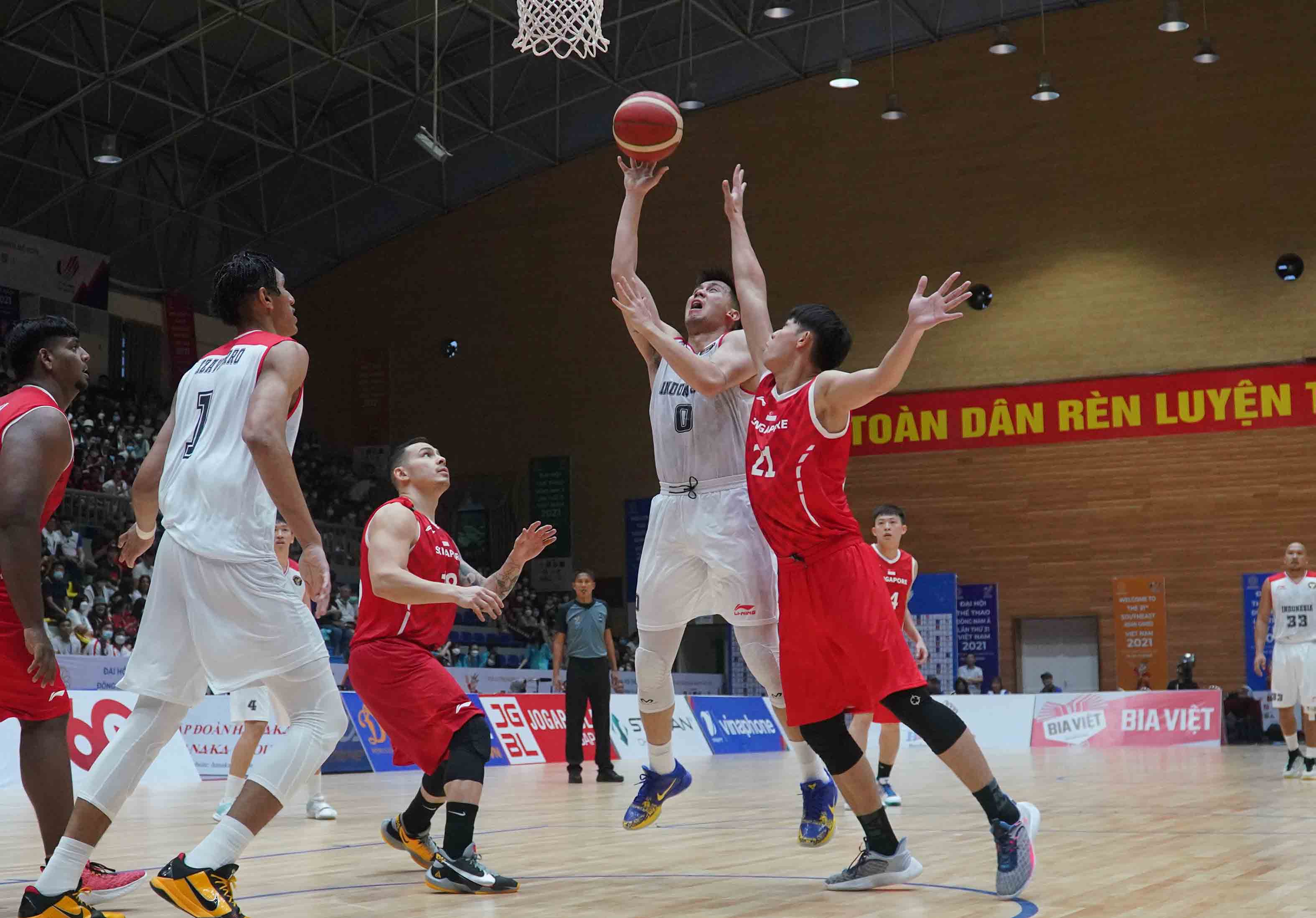 Pebasket timnas Indonesia, Juan Laurent (0) mendapat kawalan dari pebasket Singapura. Timnas basket putra Indonesia meraih kemenangan keempatnya di SEA Games 2021 dengan mengalahkan Singapura dengan skor 91-61 di Thanh Tri Gymnasium, Vietnam, Jumat 20 Mei 2022 (Photo : HO/Kemenpora/PP SIWO PWI/Erly Bahtiar/sportsmoment.id)