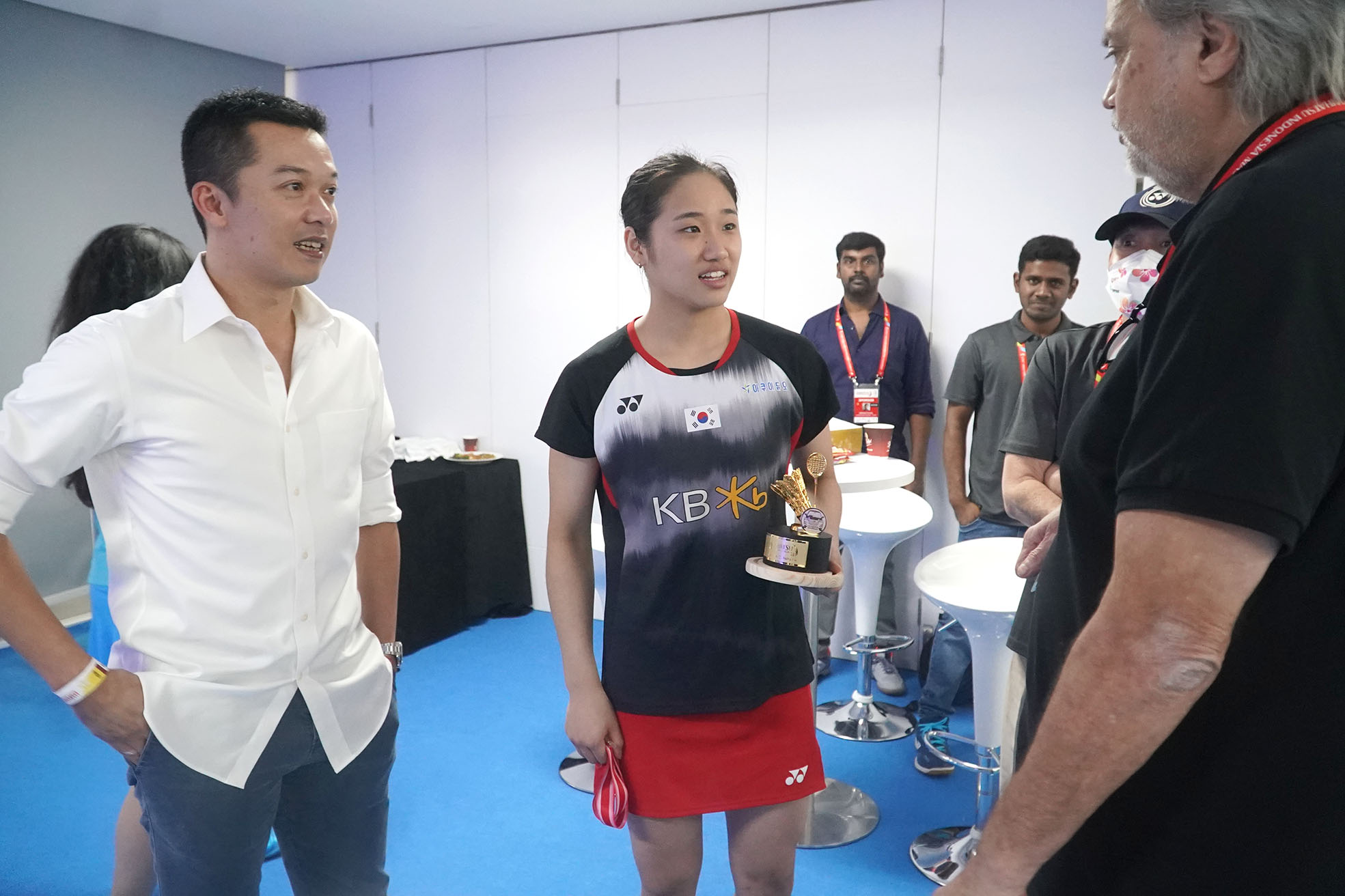 Legenda tunggal putra Indonesia, Taufik Hidayat bersama juara Daihatsu Indonesia Masters 2023 sektor tunggal putri asal Korea Selatan An Se Young, Minggu (29/1), di Istora Senayan Jakarta. (Foto : HO/Humas PP PBSI/Erly Bahtiar/Sportsmoment)