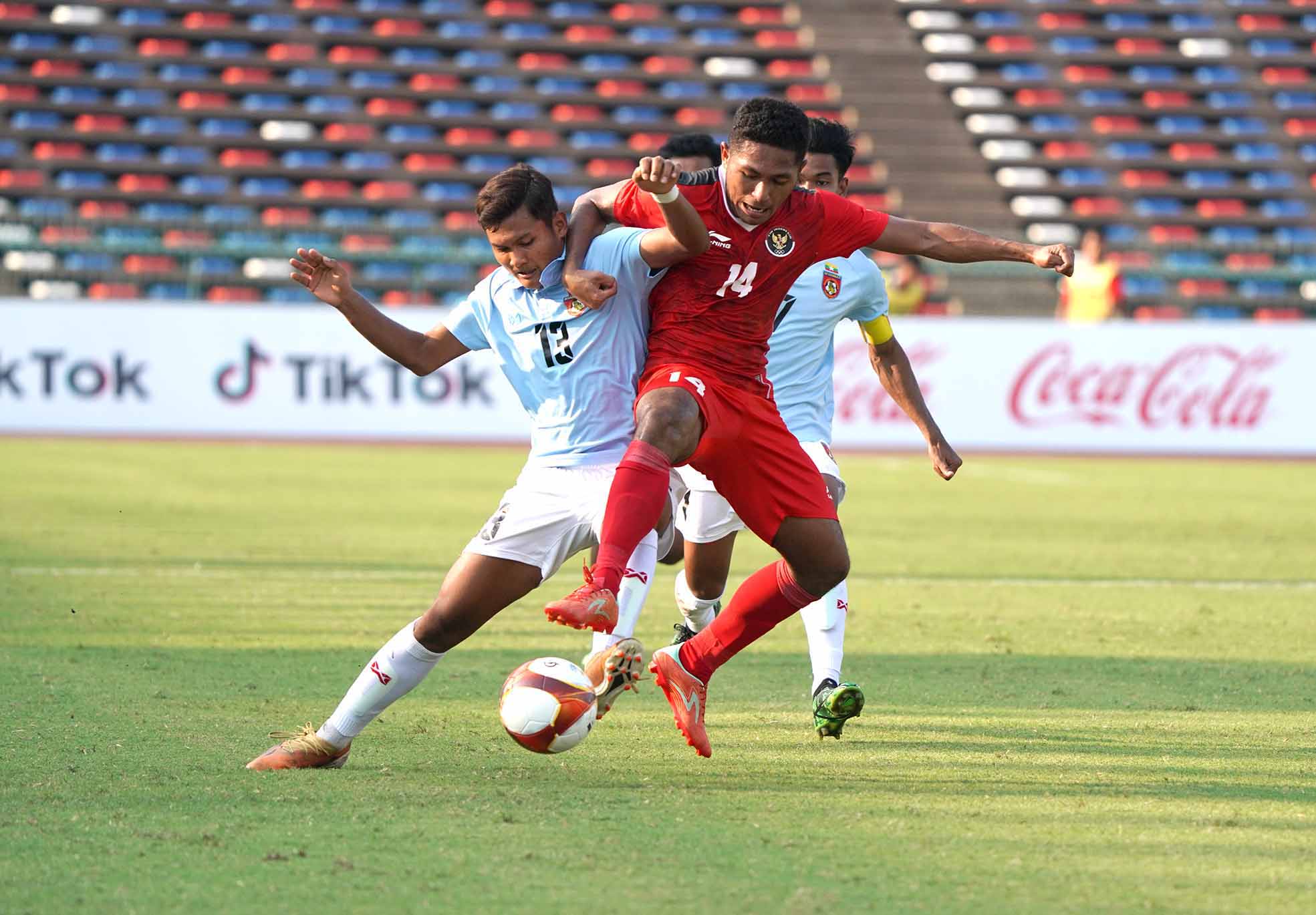 Aksi pemain Timnas Indonesia U-22, Muhammad Fajar Fathur Rachman (14) saat melawan Timnas Myanmar U-22. Indonesia berhasil menang telak 5-0 atas Myanmar pada laga kedua grup A SEA Games 2023 di National Stadium Olympic Pnom Penh Kamboja, Kamis, 4 Mei 2023 (Foto : sportsmoment.id/Erly Bahtiar).,