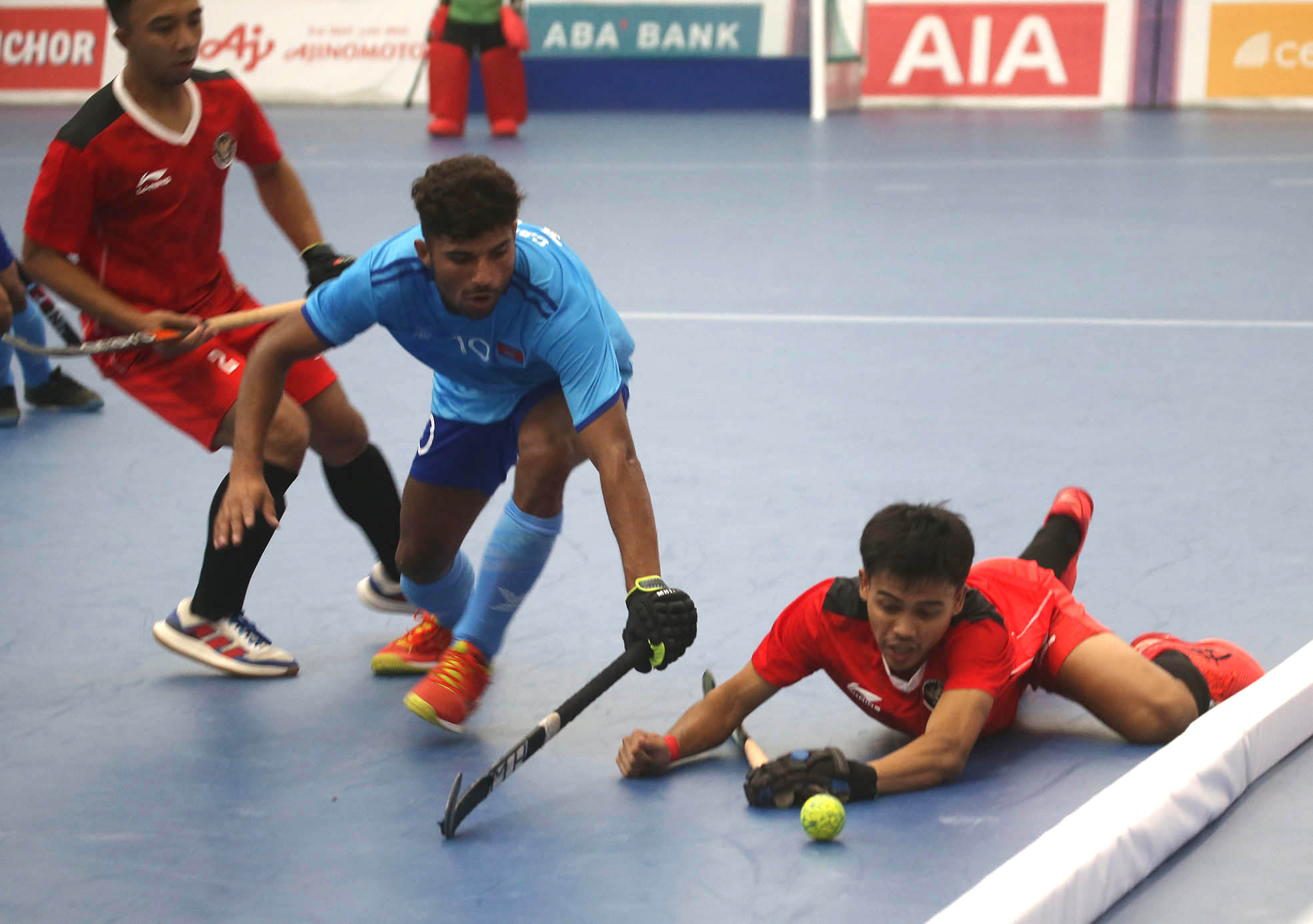 Pemain Hoki Indoor putra Indonesia, Andrea Guntara (kanan) terjatuh saat berebut bola dengan pemain Kamboja dalam penysihan group SEA Games 2023 di Phnom Penh, Kamboja, Kamis (4/5/2023). Tim Hoki Indoor Putra Indonesia mengalahkan tim Hoki putra Kamboja dengan skor 6-1. (Foto: sportsmoment.id/Husni Yamin)