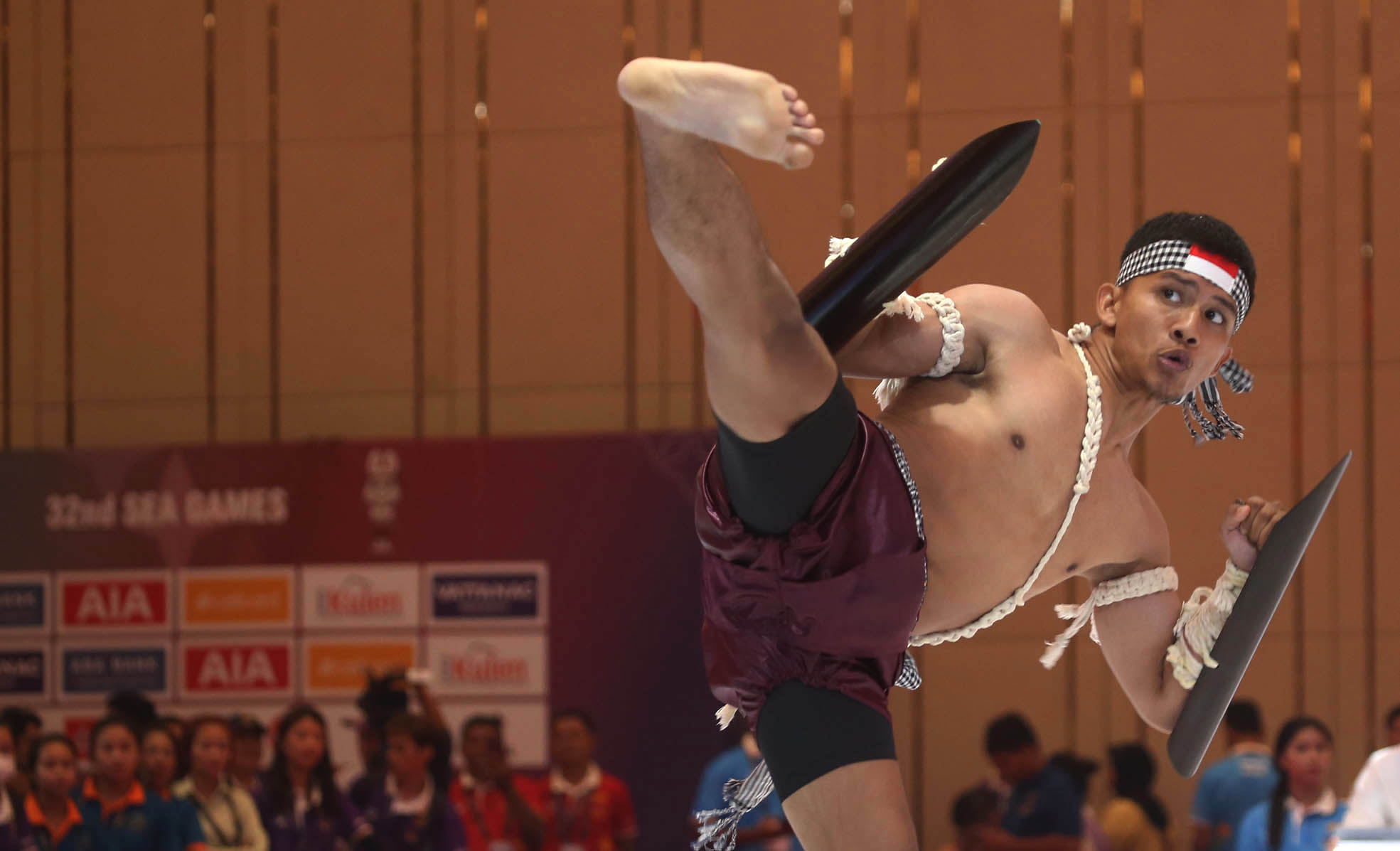 Atlet Kun Bokator putra Indonesia, Gema Nur Arifin berhasil meraih medali perunggu di kelas Men's Single Bamboo Shield Form SEA Games 2023 Phnom Penh Kamboja, di Chrouy Changvar Convention Center, Kamis (4/5/2023). (Foto: sportsmoment.id/Husni Yamin)