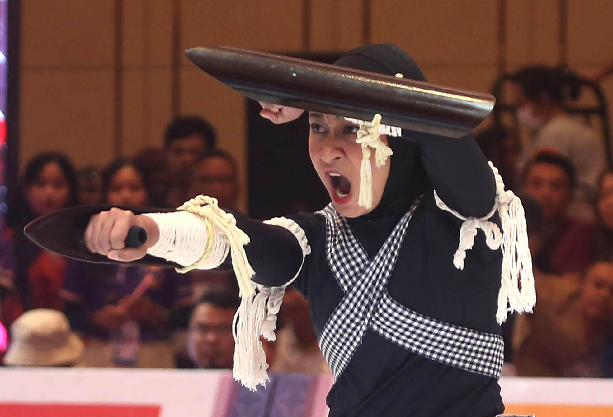 Atlet Kun Bokator putri Indonesia, Deslya Anggraini berhasil meraih medali perunggu di kelas Women's Single Bamboo Shield Form SEA Games 2023 Phnom Penh Kamboja, di Chrouy Changvar Convention Center, Kamis (4/5/2023). (Foto: sportsmoment.id/Husni Yamin),