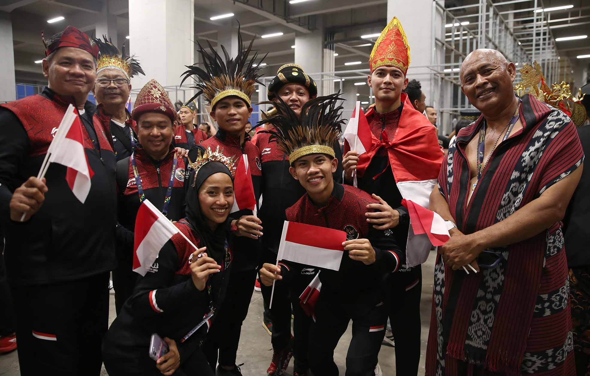 Para atlet Indonesia bersiap untuk mengikuti defile kontingen pembukaan Sea Games 2023 Kamboja di Marodok Tech National Stadium, Phnom Penh (5/5/2023). (sportsmoment.id/Husni Yamin)