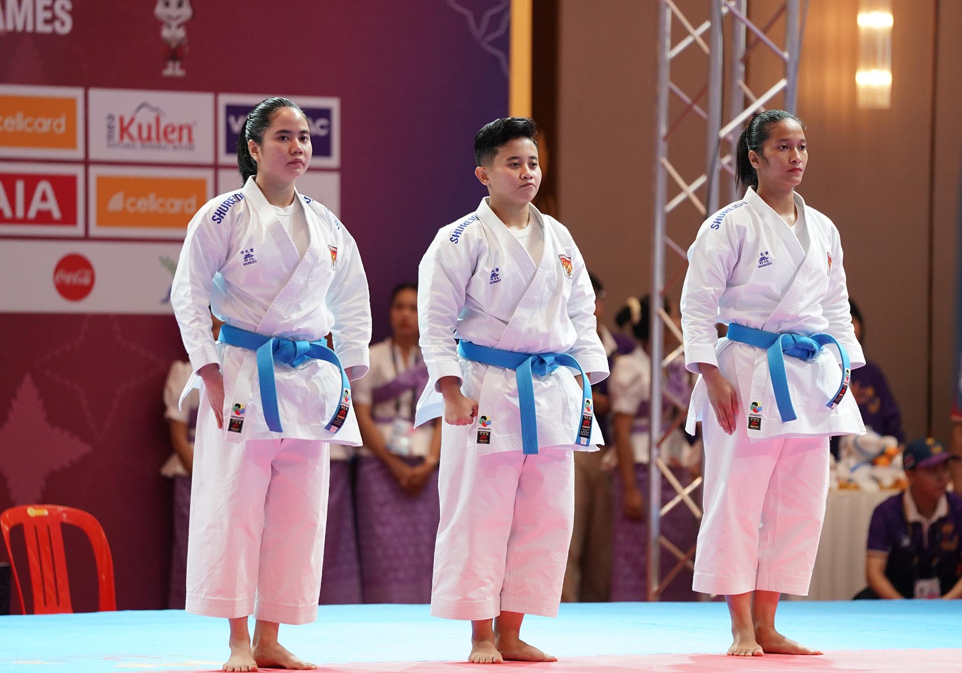 Team karateka putri Indonesia Dian Monika Nababan, Anugerah Nurul Lucky, Emilia Sri Hanandyta berhasil meraih medali perak kategori kata tim putri pada SEA Games 2023 di Chroy Changvar Convention Center Phnom Penh, Kamboja, Sabtu (6/5). (Foto : sportsmoment.id/Erly Bahtiar)