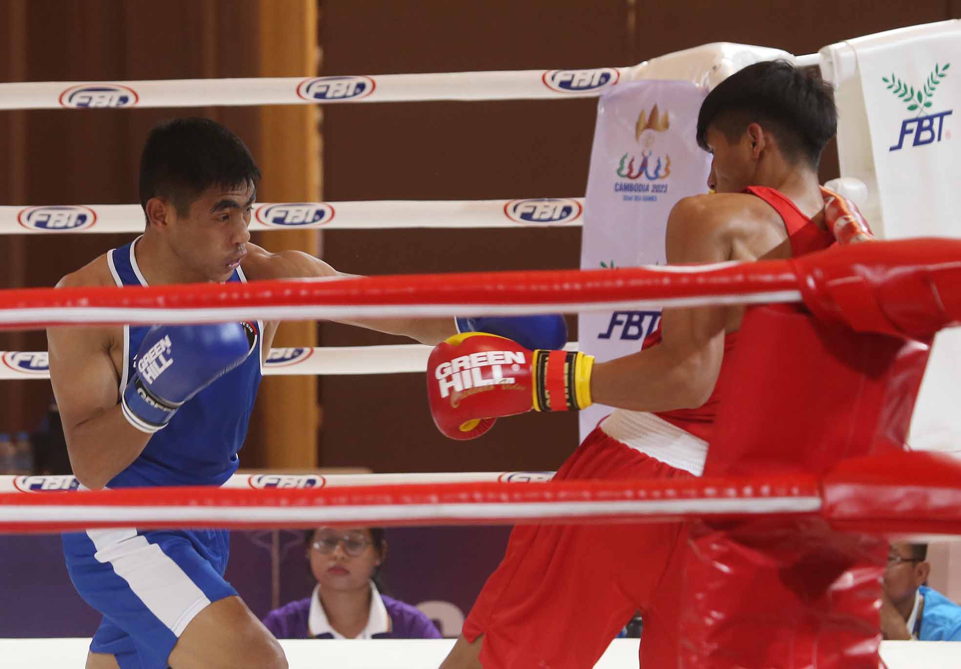 Petinju Indonesia Asri Udin yang turun dikelas 57 kg mengalahkan petinju tuan rumah Kamboja di Sea Games 2023 Kamboja, ,Chory Changvagar Convention Hall, Phnom Penh (7/5/2023) (Sportsmoment.id/Husni Yamin)