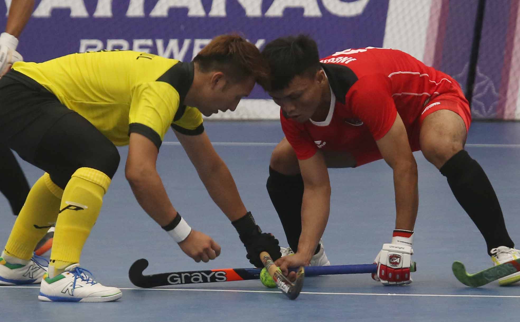 Pemain Hoki Indoor Indonesia, Adi Leksono (kanan) berebut bola dengan pemain Malaysia Cabang Hoki Indoor Putra Sea Games 2023 di Dinosaur Park Hall, Phnom Penh, Kamboja (6/7/2023) (Sportsmoment.id/Husni Yamin)