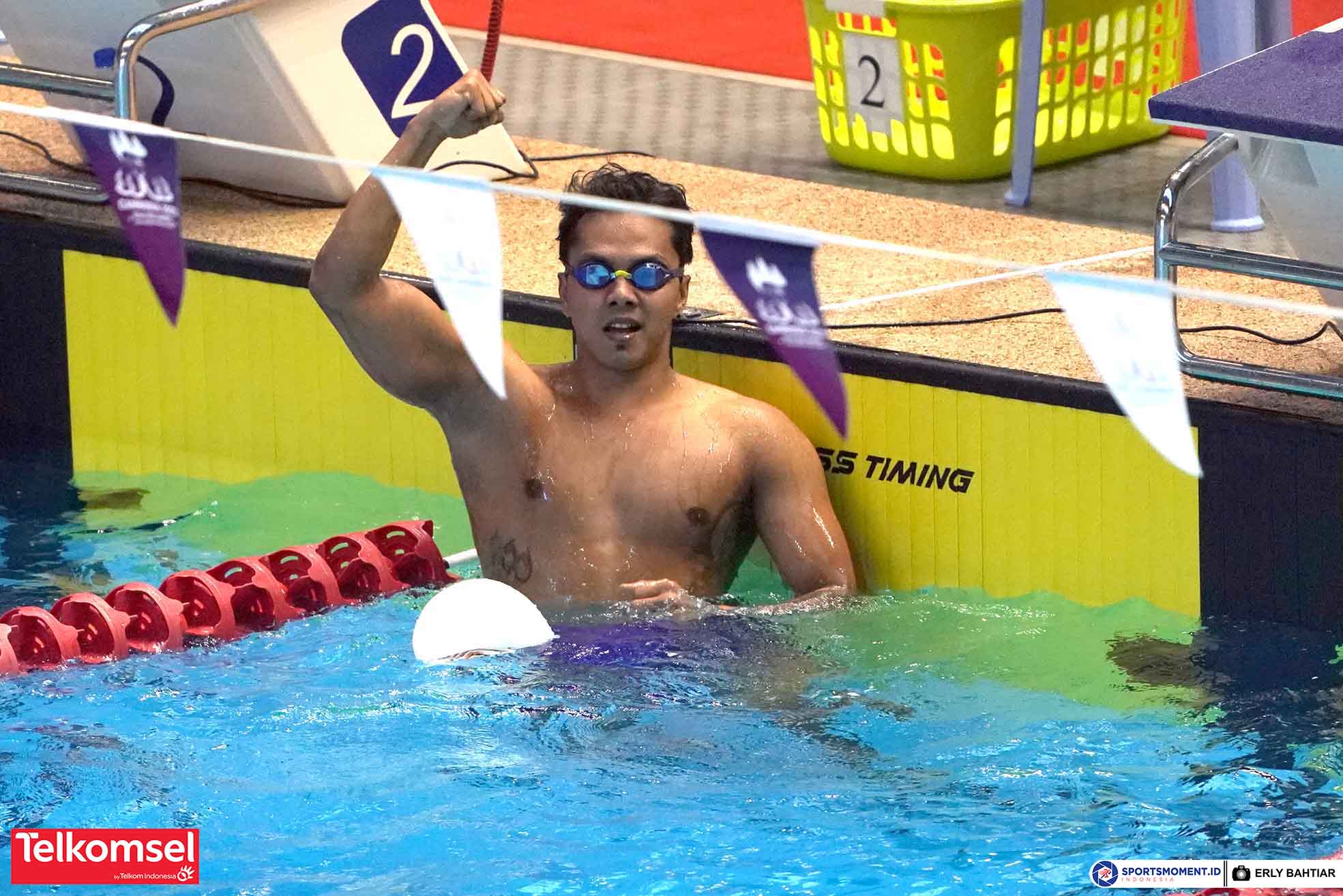 Atlet renang Indonesia, I Gede Siman Sudartawa berhasil meraih medali emas SEA Games 2023 Kamboja di nomor 50 meter gaya punggung putra yang berlangsung di Marodok Techno Aquatic Centre, Minggu (7/5). (Foto : sportsmoment.id/Erly Bahtiar)
