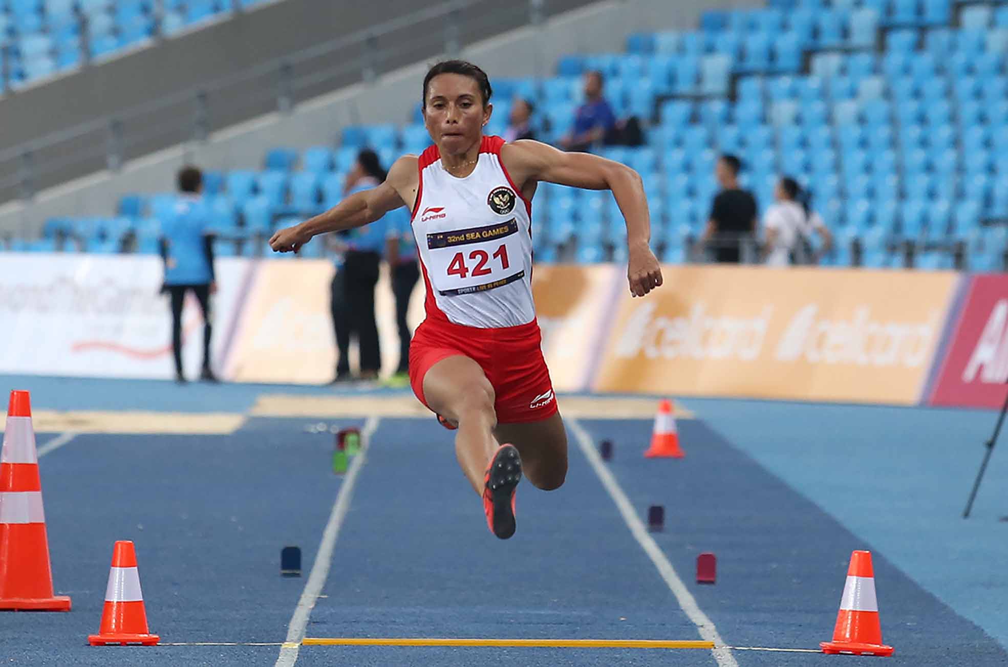 AAtlet Putri Indonesia, Maria Londa turun di nomer Lompat Jauh meraih medali perak Sea Games 2023 Kamboja di Morodok Techo National Stadium, Phnom Penh (8/5/2023) (Sportsmoment.id/Husni Yamin)