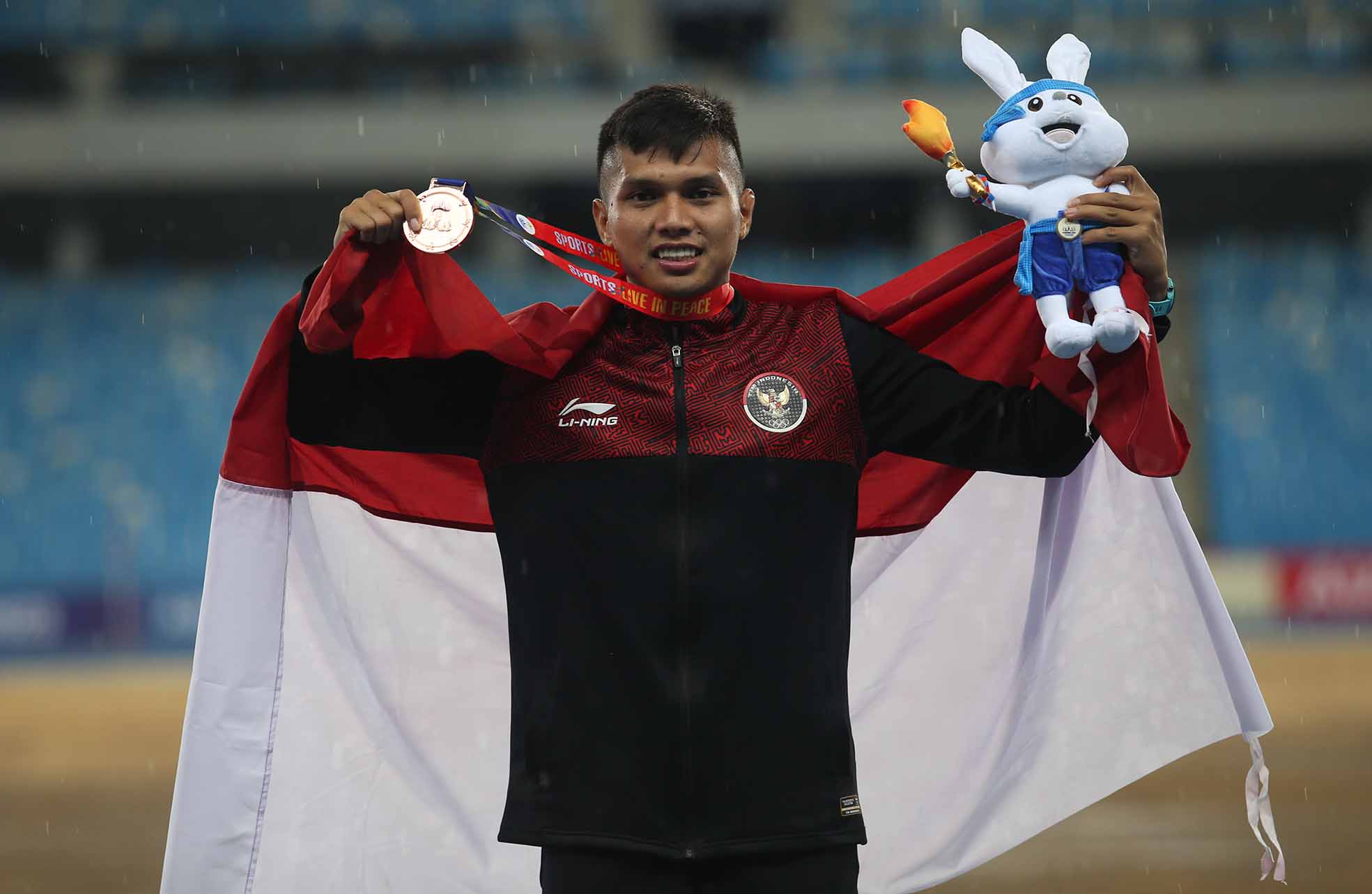Pelari Indonesia, Wahyudi Putra meraih medali perunggu di nomer 1500 meter putra Sea Games 2023 Kamboja di Morodok Techo National Stadium, Phnom Penh (8/52023) (Sportsmoment.id/Husni Yamin)