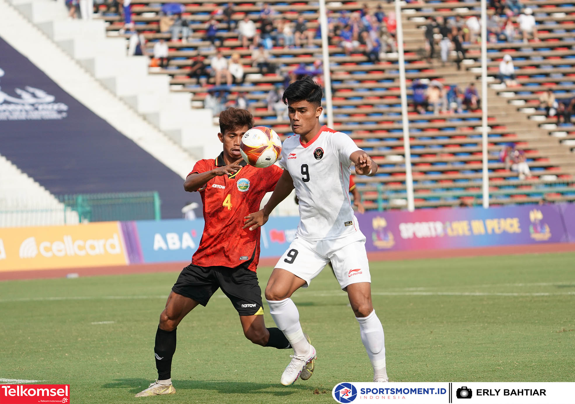 Aksi pemain Timnas Indonesia U-22, Muhammad Ramadhan Sananta (9) saat melawan Timnas Timor Leste U-22. Indonesia berhasil menang 3-0 atas Timor Leste pada laga ketiga grup A SEA Games 2023 di National Stadium Olympic Pnom Penh Kamboja, Minggu, 7 Mei 2023 (Foto : sportsmoment.id/Erly Bahtiar).
