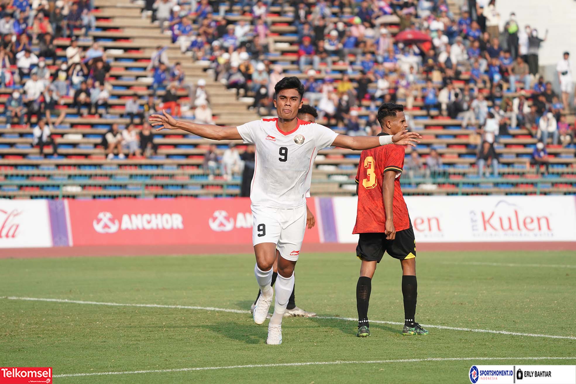 Selebrasi pemain Timnas Indonesia U-22, Muhammad Ramadhan Sananta (9) setelah berhasil mencetak gol ke gawang Timnas Timor Leste U-22. Indonesia berhasil menang 3-0 atas Timor Leste pada laga ketiga grup A SEA Games 2023 di National Stadium Olympic Pnom Penh Kamboja, Minggu, 7 Mei 2023 (Foto : sportsmoment.id/Erly Bahtiar).