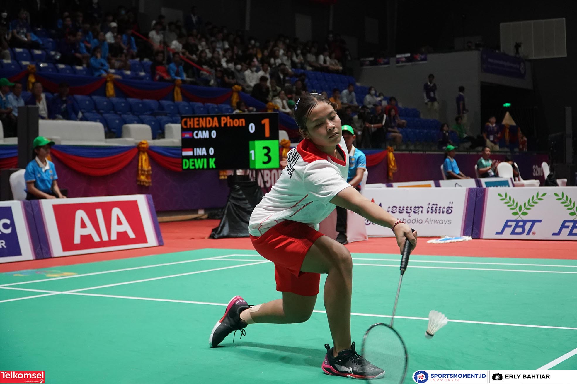 Tunggal putri Indonesia, Komang Ayu Cahya Dewi berhasil mengalahkan tunggal putri Kamboja, Phon Chenda dengan skor telak 21-4, 21-4 pada laga perempatfinal beregu putri SEA Games 2023 di Morodok Techo National Stadium Badminton Hall, Selasa (9/5). Indonesia sementara unggul 1-0 dari Kamboja. (Foto : sportsmoment.id/Erly Bahtiar)