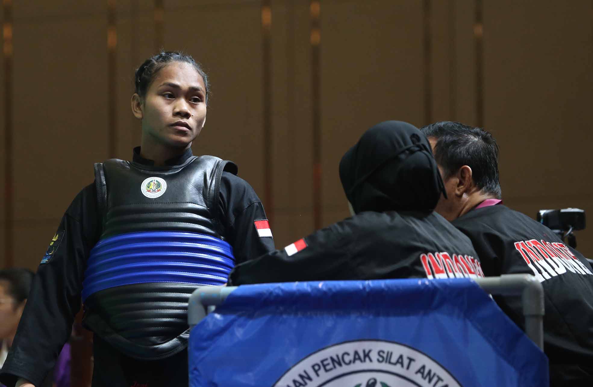 Pesilat Putri Indonesia, Jenis Elvis Kause berhasil Masuk babak final cabang Pencak Silat Kelas C Sea Games 2023 Kamboja, di Chory Changvar Internastional Convention Center Phnom Penh (9/5/2023). (Sportsmoment.id/Husni Yamin)