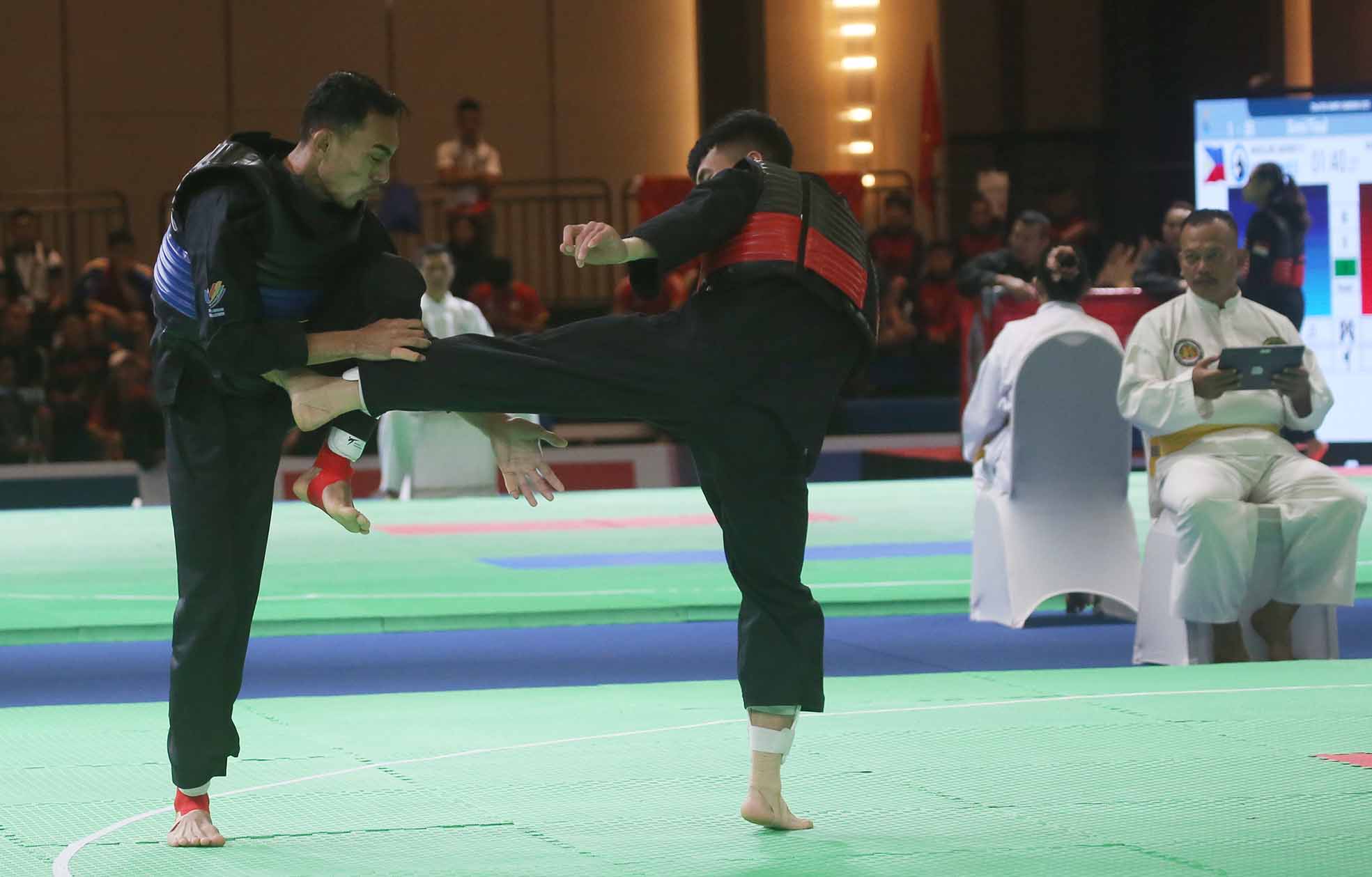 Pesilat Putra Indonesia, Muhammad Zaki Zikrillah (kiri) berhasil Masuk babak final cabang Pencak Silat Kelas B Sea Games 2023 Kamboja, di Chory Changvar Internastional Convention Center Phnom Penh (9/5/2023). (Sportsmoment.id/Husni Yamin)