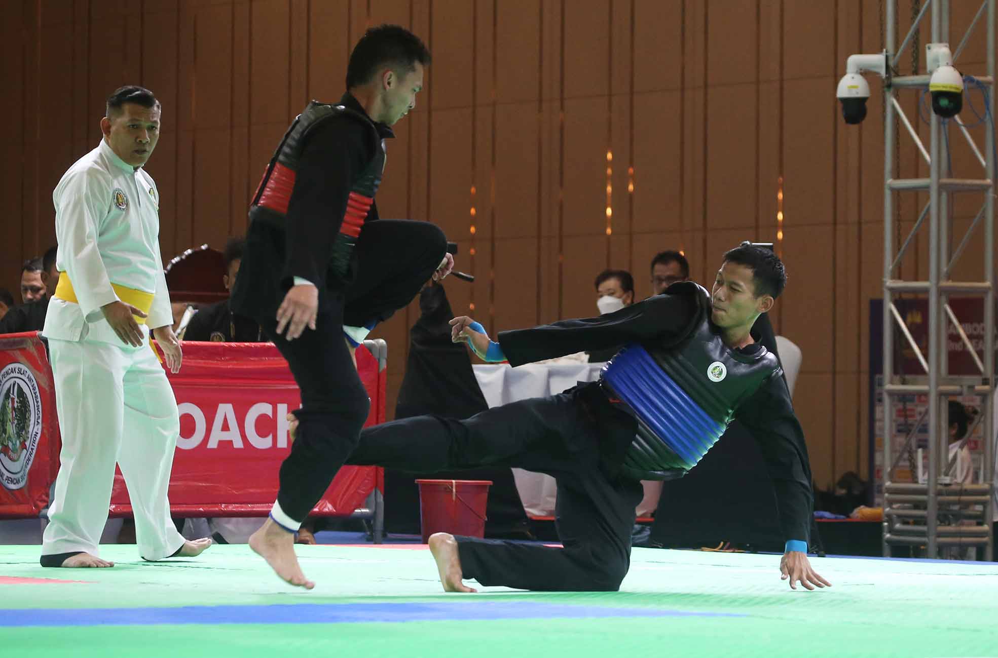 Pesilat Putra Indonesia, Tito Hendra Septa Kurnia (kanan) berhasil Masuk babak final cabang Pencak Silat Kelas E Sea Games 2023 Kamboja, di Chory Changvar Internastional Convention Center Phnom Penh (9/5/2023). (Sportsmoment.id/Husni Yamin)