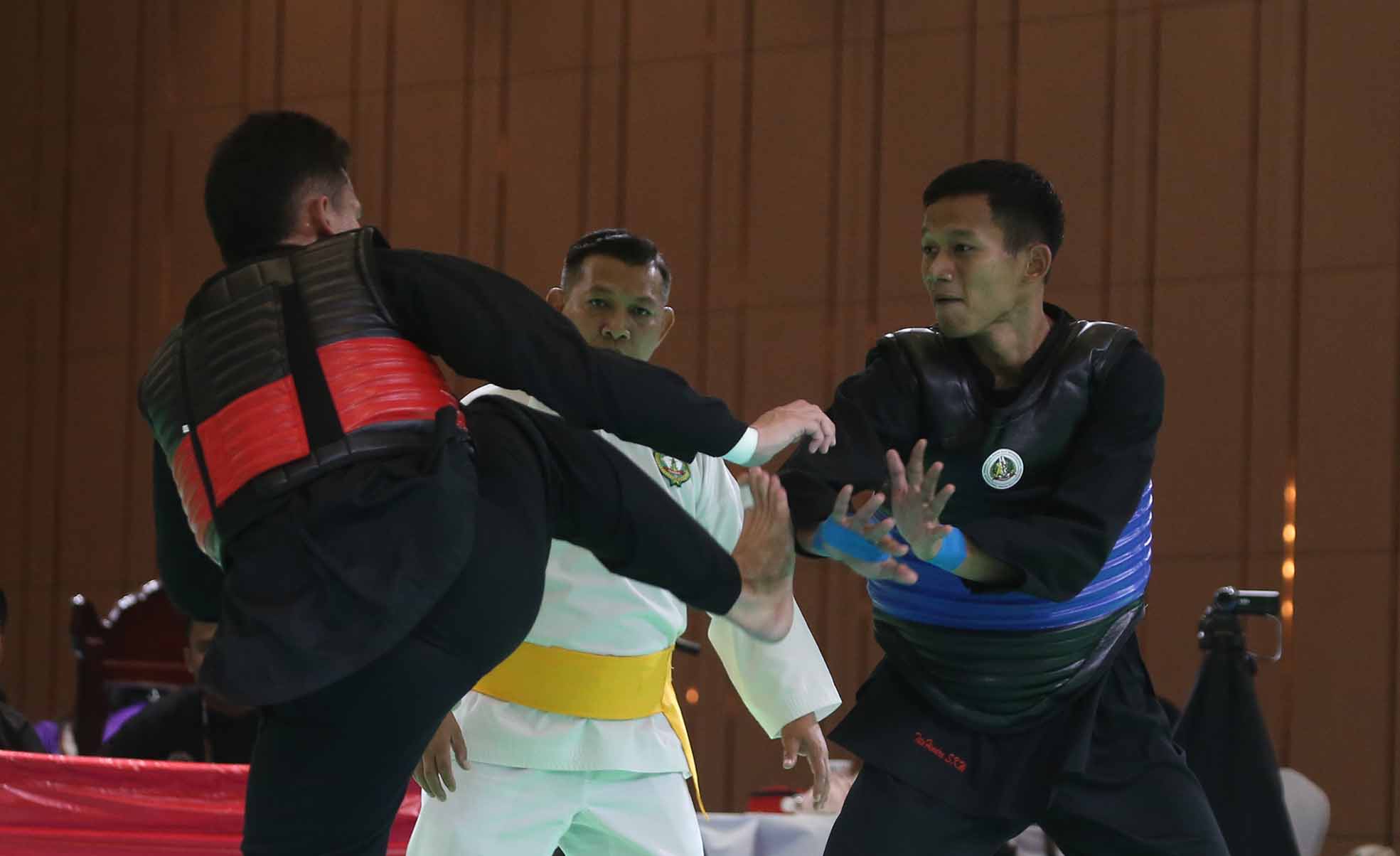 Pesilat Putra Indonesia, Tito Hendra Septa Kurnia (kanan) berhasil Masuk babak final cabang Pencak Silat Kelas E Sea Games 2023 Kamboja, di Chory Changvar Internastional Convention Center Phnom Penh (9/5/2023). (Sportsmoment.id/Husni Yamin)