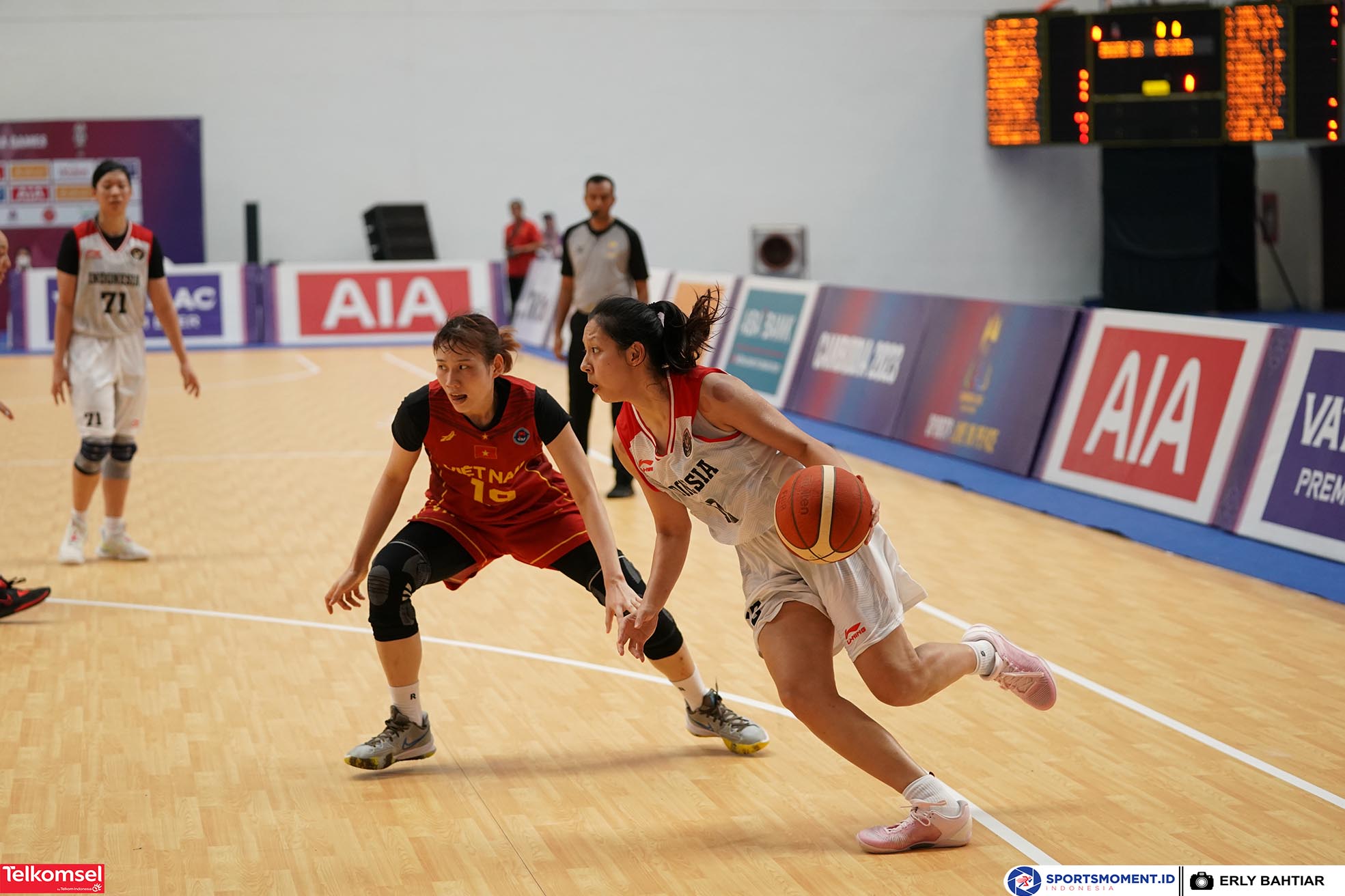 Aksi pebasket putri Indonesia, Adelaide Callista Wongsohardjo (12) pada laga perdana melawan Tim Basket Putri Vietnam pada gelaran SEA Games 2023 yang diselenggarakan di Morodok Techo Stadium, Selasa (9/5/2023) . Indonesia unggul dengan skor 67-62 atas Vietnam. (Foto: sportsmoment.id/Erly Bahtiar)