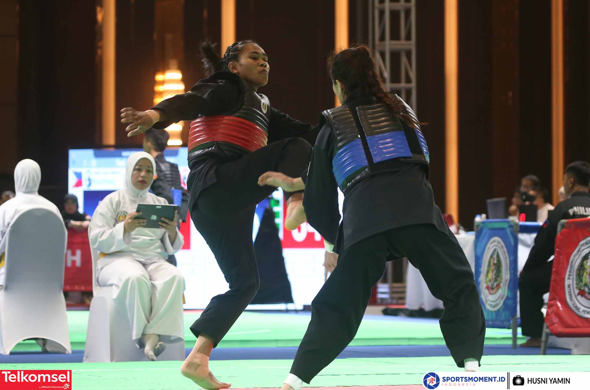 Pesilat Indonesia, Jeni Elvis Kause berhasil merebut medali Emas di Nomor Tanding Kelas C (55kg-60kg) Sea Games 2023 Kamboja di Chory Changvar International Convention and Exibhition Center, Phonm Penh, Rabu (10/5/2023). (Foto: sprtsmoment.id/Husni Yamin)