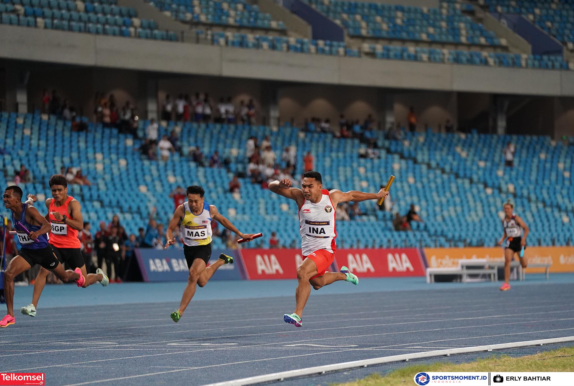 Aksi Sudirman Hadi pada cabang olahraga atletik nomor 4x100 meter estafet putra. Tim atletik putra Indonesia berhasil meraih medali emas di nomor 4x100 meter estafet putra SEA Games 2023 di Morodok Techo National Stadium, Phnom Penh, Kamboja, Rabu (10/5/2023).(Foto : sportsmoment.id/Erly Bahtiar)