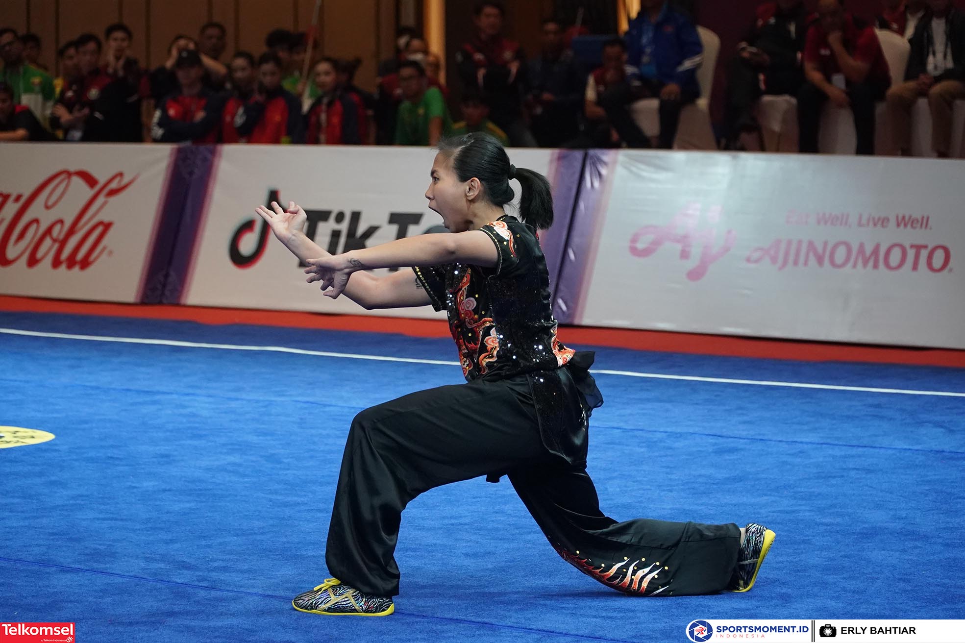 Atlet Wushu putri Indonesia, Tasya Ayu Puspa Dewi berhasil meraih medali perak cabang olahraga Wushu di nomor Women’s Nanquan gelaran SEA Games 2023 di Chory Changvar International Convention and Exhibition Center, Phnom Penh, Rabu (10/5). (Foto : sportsmoment.id/Erly Bahtiar)