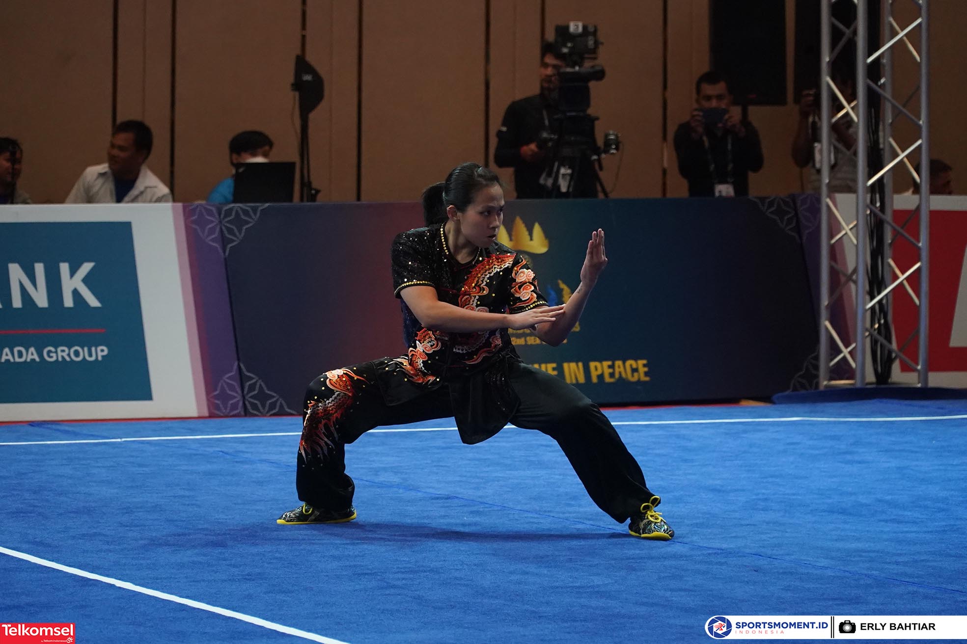 Atlet Wushu putri Indonesia, Tasya Ayu Puspa Dewi berhasil meraih medali perak cabang olahraga Wushu di nomor Women’s Nanquan gelaran SEA Games 2023 di Chory Changvar International Convention and Exhibition Center, Phnom Penh, Rabu (10/5). (Foto : sportsmoment.id/Erly Bahtiar)