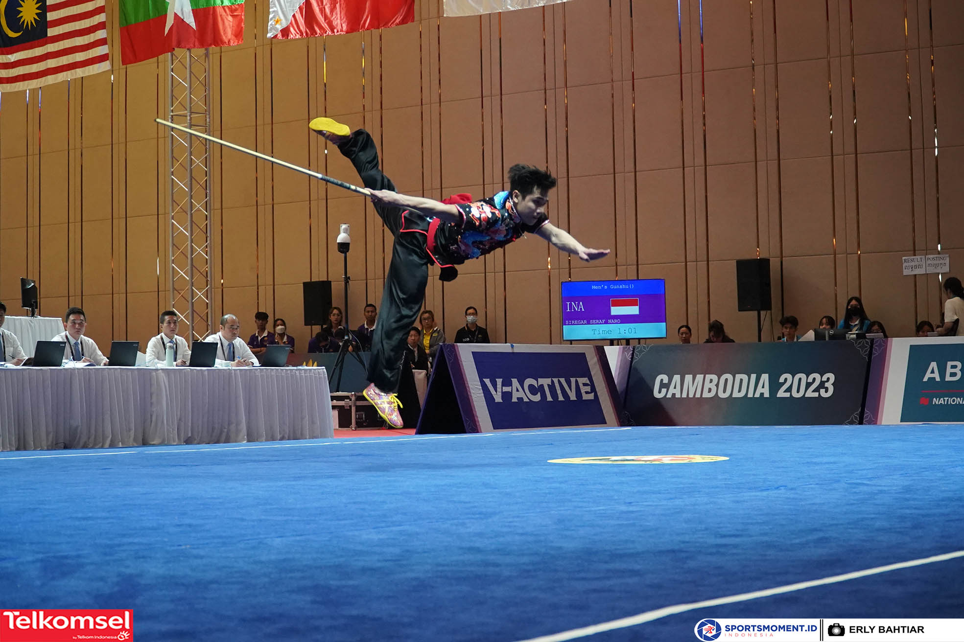 Aksi atlet Wushu putra Indonesia, Seraf Naro Siregar di nomor Men’s Daoshu+Gunshu pada gelaran SEA Games 2023 di Chory Changvar International Convention and Exhibition Center, Phnom Penh, Rabu (10/5). (Foto : sportsmoment.id/Erly Bahtiar)