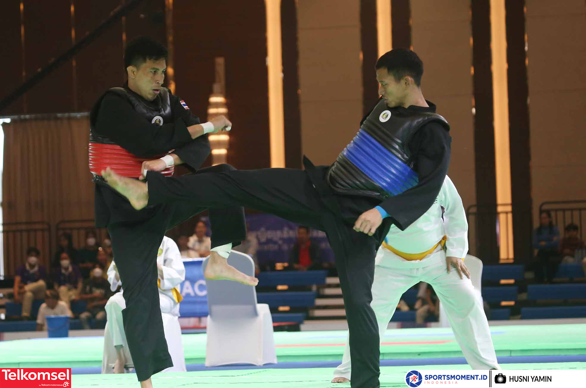 Pesilat Indonesia, Tito Hendra Septa Kurnia (kanan) berhasil merebut medali Emas di nomor Tanding Kelas E (65 kg - 70 kg) setelah di final mengalahkan pesilat Thailand pada gelaran Sea Games 2023 Kamboja di Chory Changvar International Convention and Exibhition Center, Phnom Penh, Rabu (10/5/2023). (Foto: sportsmoment.id/Husni Yamin)