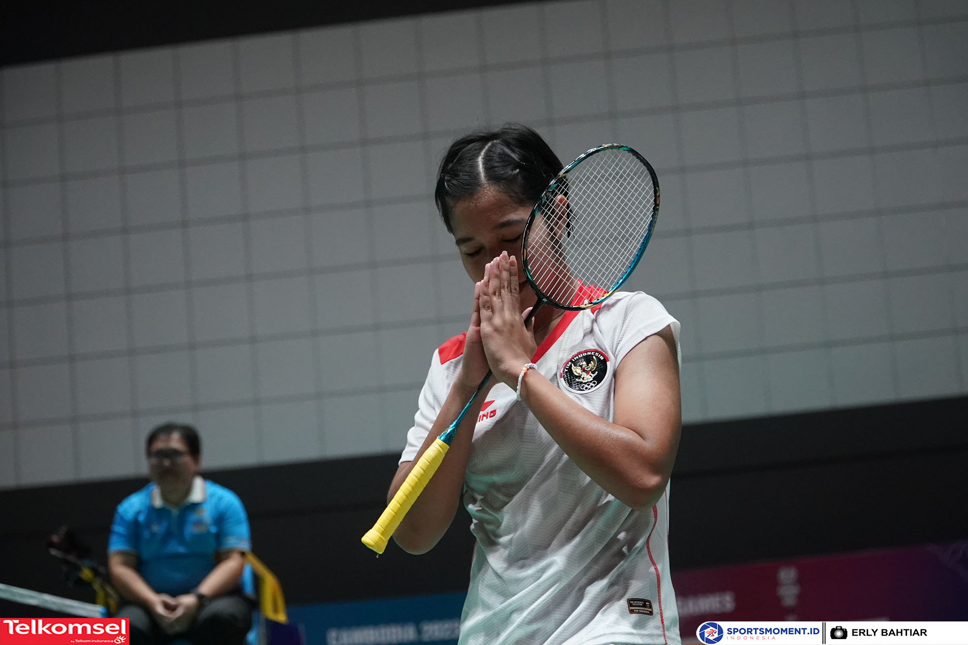 Aksi tunggal putri Indonesia, Ester Nurumi Tri Wardoyo saat berlaga di partai puncak gelaran Sea Games 2023 di Morodok Techno National Sports Complex, Kamis (11/5/2023). Tim beregu putri Indonesia takluk dari tim beregu putri Thailand dengan skor 0-3 dan harus puas dengan medali perak. (Foto: sportsmoment.id/Erly Bahtiar)
