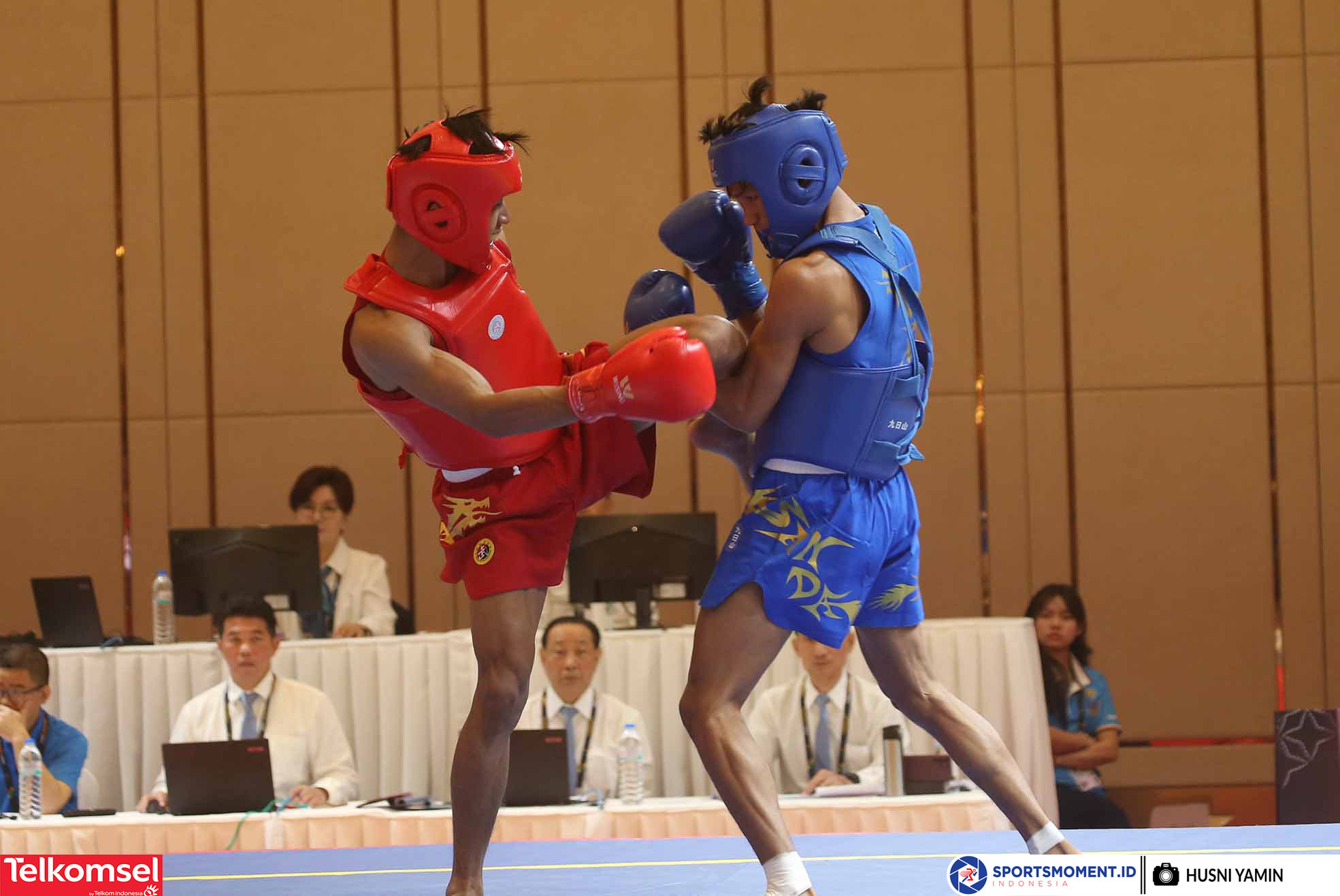 Atlet Wushu Indonesia, Laksamana Pandu memastikan maju kebabak final setelah mengalahkan atlet Wushu Philipina di Nomor Sanda 52 Kg Sea Games 2023 Kamboja di Chory Changvar International Convention Center, Phnom Penh (11/5/2023) (Sportsmoment.id/Husni Yamin)