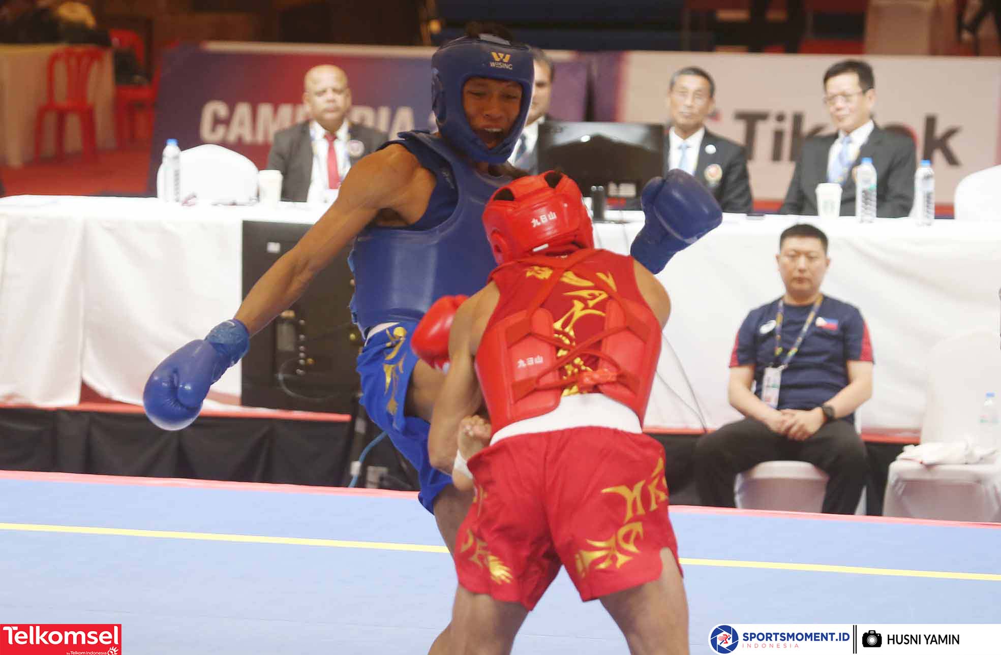 Atlet Wushu Indonesia, Bintang Reindra Nada Guitara memastikan maju ke babak final setelah mengalahkan atlet Wushu Philipina di Nomor Sanda 56 Kg Sea Games 2023 Kamboja di Chory Changvar International Convention Center, Phnom Penh (11/5/2023) (Sportsmoment.id/Husni Yamin),