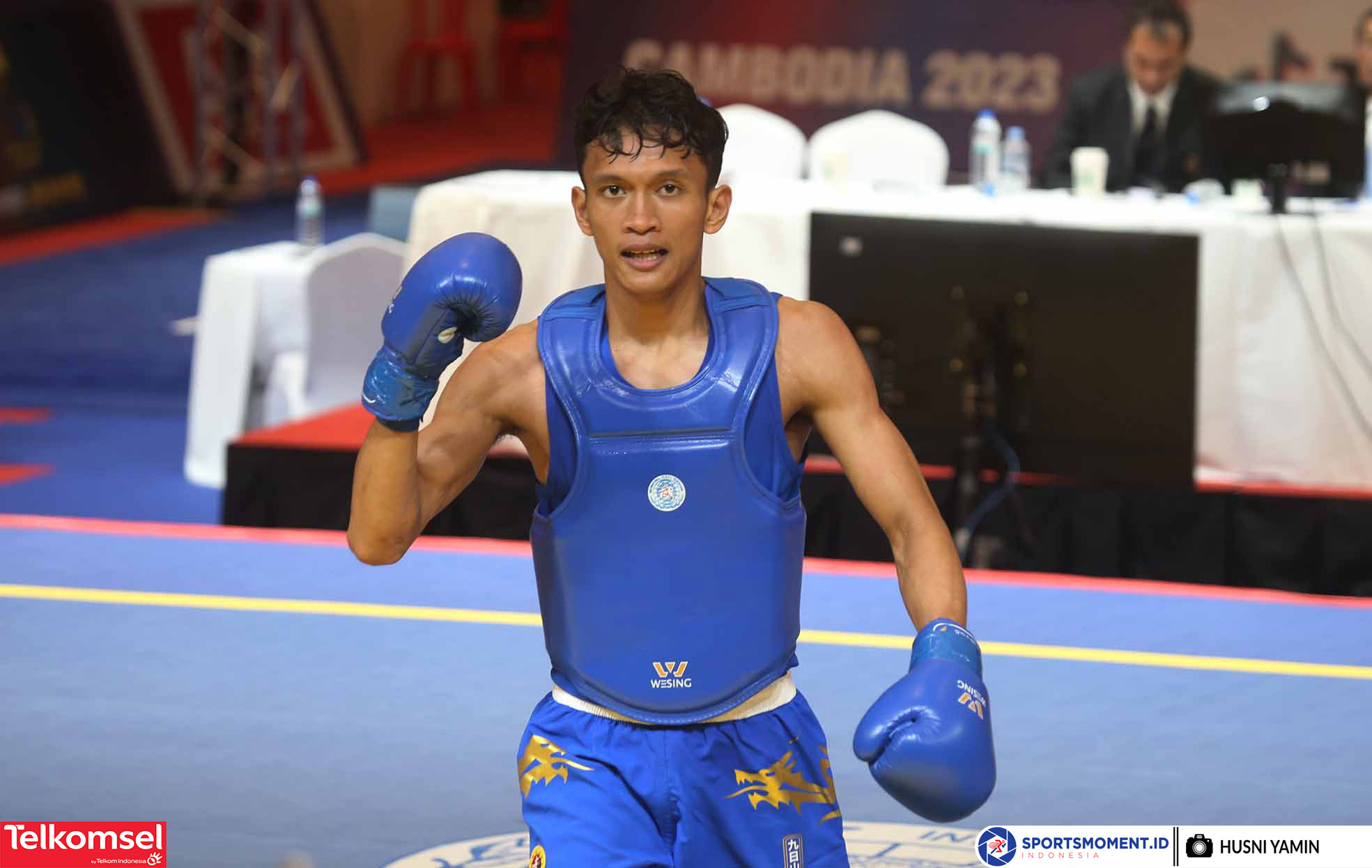 Atlet Wushu Indonesia, Bintang Reindra Nada Guitara memastikan maju kebabak final setelah mengalahkan atlet Wushu Philipina di Nomor Sanda 56 Kg Sea Games 2023 Kamboja di Chory Changvar International Convention Center, Phnom Penh (11/5/2023) (Sportsmoment.id/Husni Yamin)