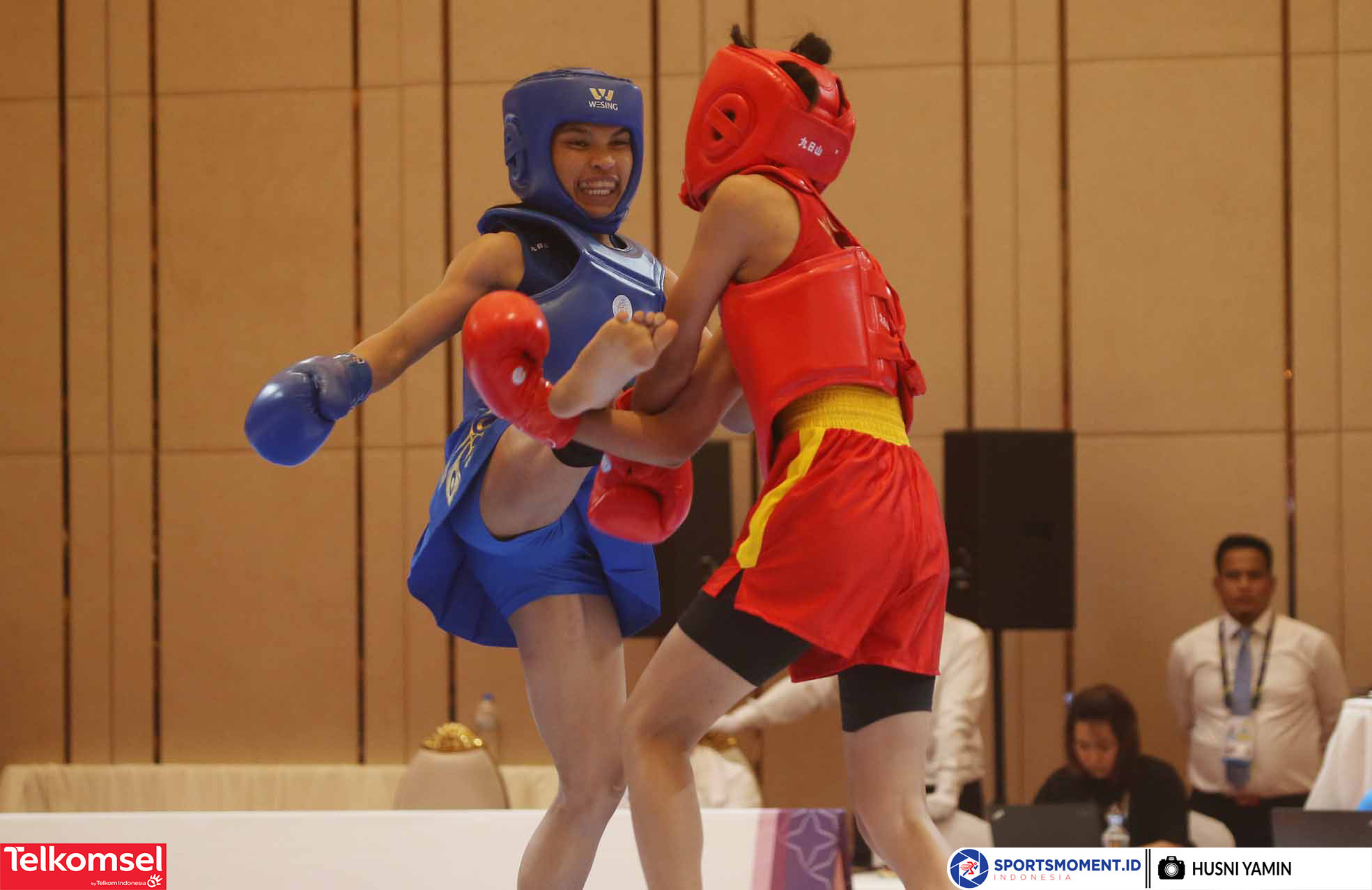 Atlet Wushu Indonesia, Rossa Beatrice Malau memastikan mendapatkan medali Emas di Nomor Sanda 54 Kg Sea Games 2023 Kamboja di Chory Changvar International Convention Center, Phnom Penh (11/5/2023) (Sportsmoment.id/Husni Yamin)