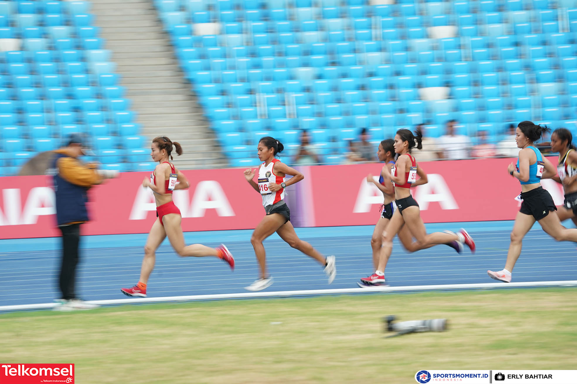 Pelari putri Indonesia, Odekta Elvina Naibaho (kedua dari depan) meraih medali perunggu cabang olahraga atletik nomor 10.000 meter putri SEA Games 2023 di Morodok Techo National Stadium, Phnom Penh, Jum’at (12/5). (Foto: sportsmoment.id/Erly Bahtiar)