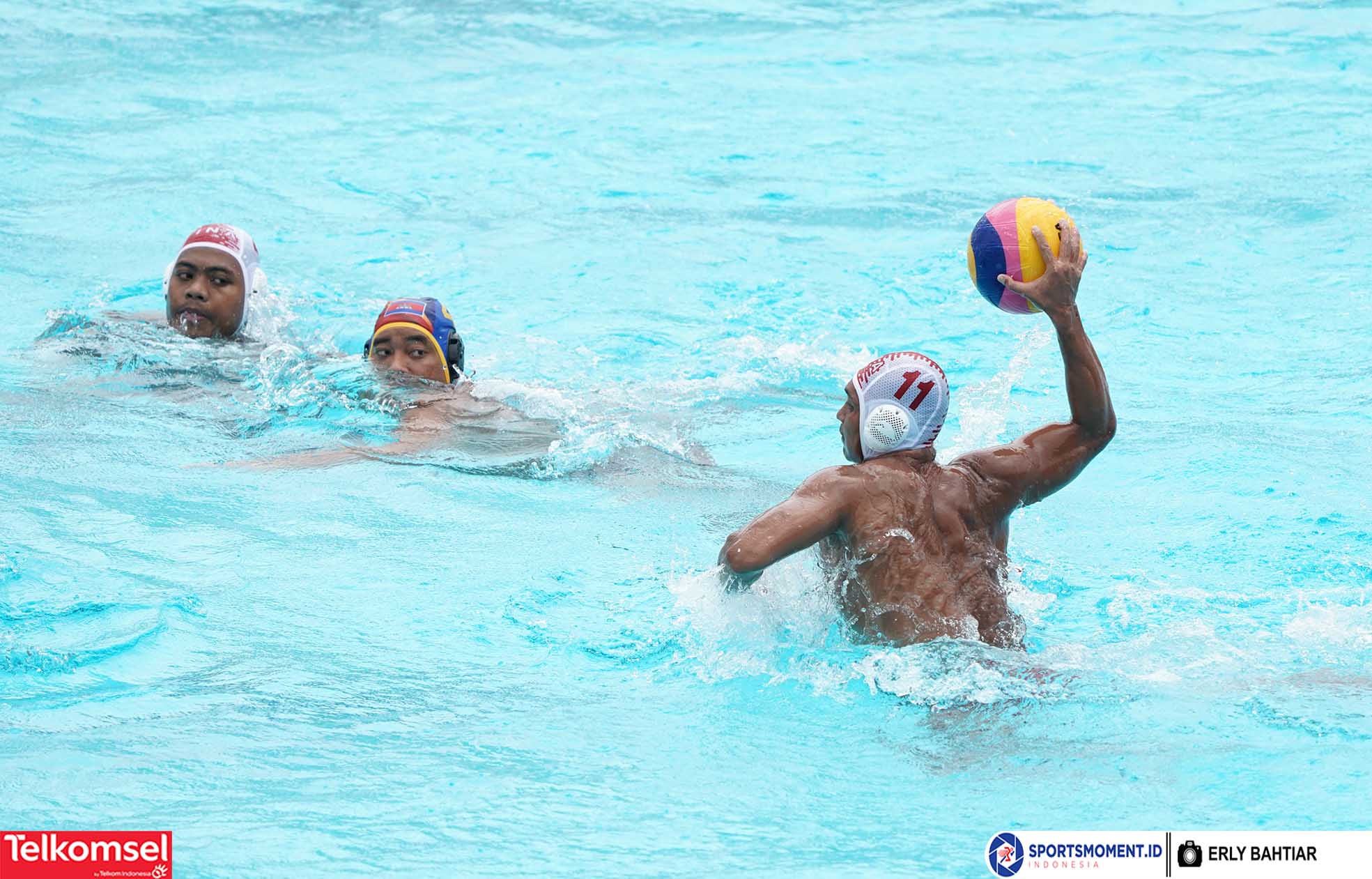 Aksi atlet polo air Indonesia, Rian Rinaldo pada laga perdana SEA Games 2023 melawan tuan rumah Kamboja di Olimpic Stadium, Jum’at (12/5). Indonesia menang telak 37-2 atas Kamboja. (Foto : sportsmoment.id/Erly Bahtiar)