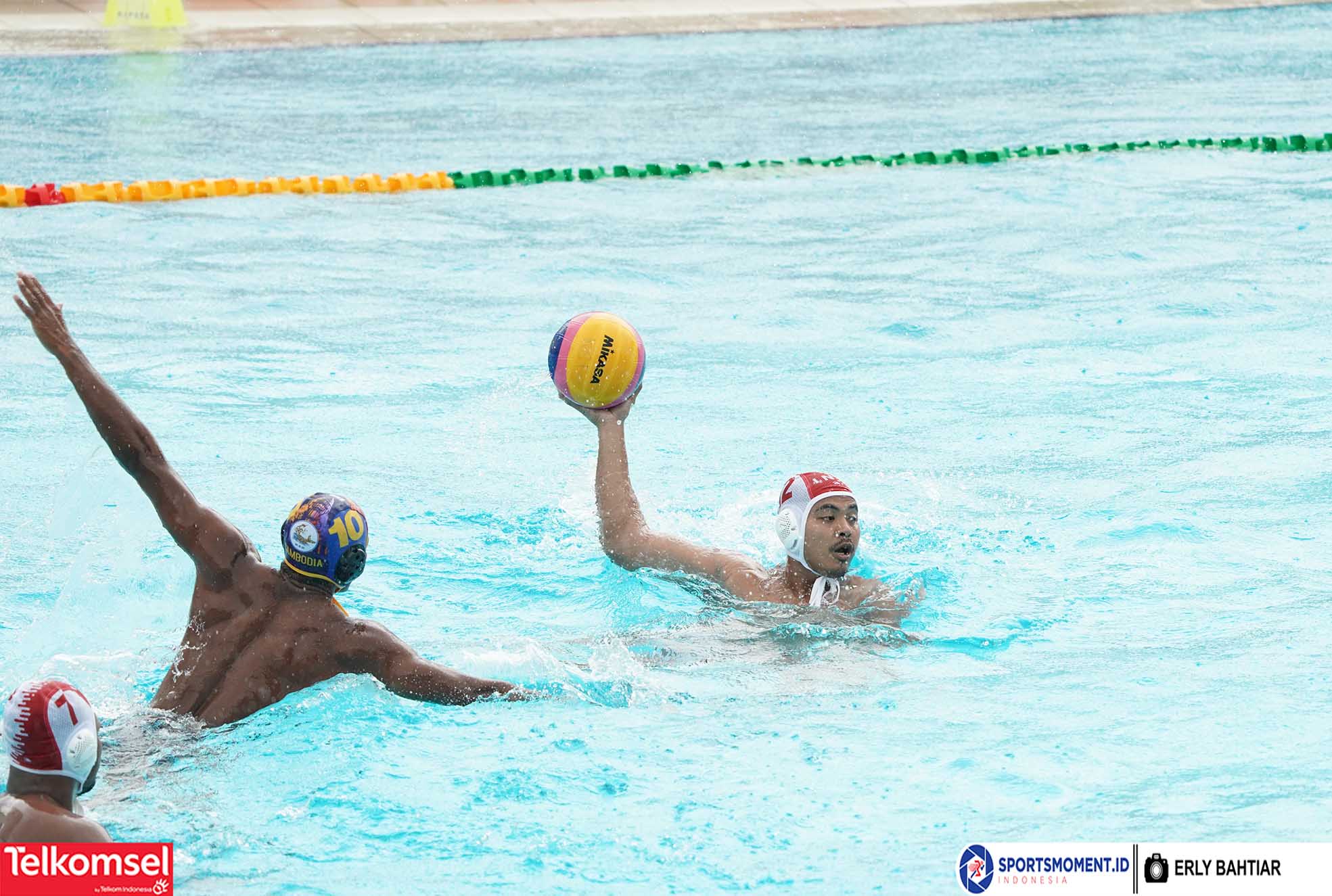 Aksi atlet polo air Indonesia, Zaenal Arifin pada laga perdana SEA Games 2023 melawan tuan rumah Kamboja di Olimpic Stadium, Jum’at (12/5). Indonesia menang telak 37-2 atas Kamboja. (Foto : sportsmoment.id/Erly Bahtiar)