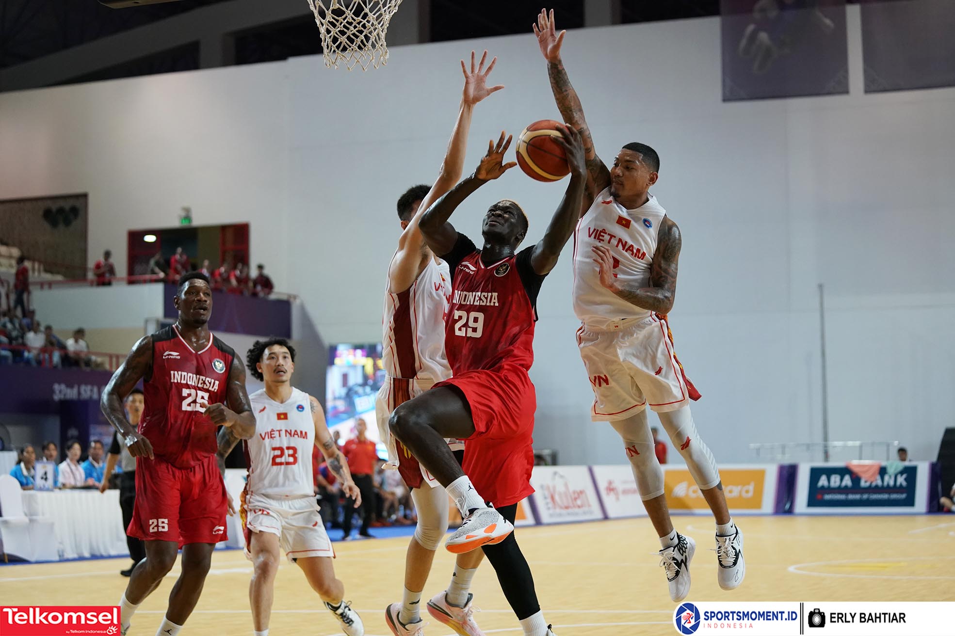 Aksi pebasket putra Indonesia, Dame Diagne (29) pada laga kedua SEA Games 2023 melawan tim basket putra Vietnam di Morodok Techo National Stadium, Jum’at (12/5). Indonesia menang 88-82 atas Vietnam. (Foto : sportsmoment.id/Erly Bahtiar)