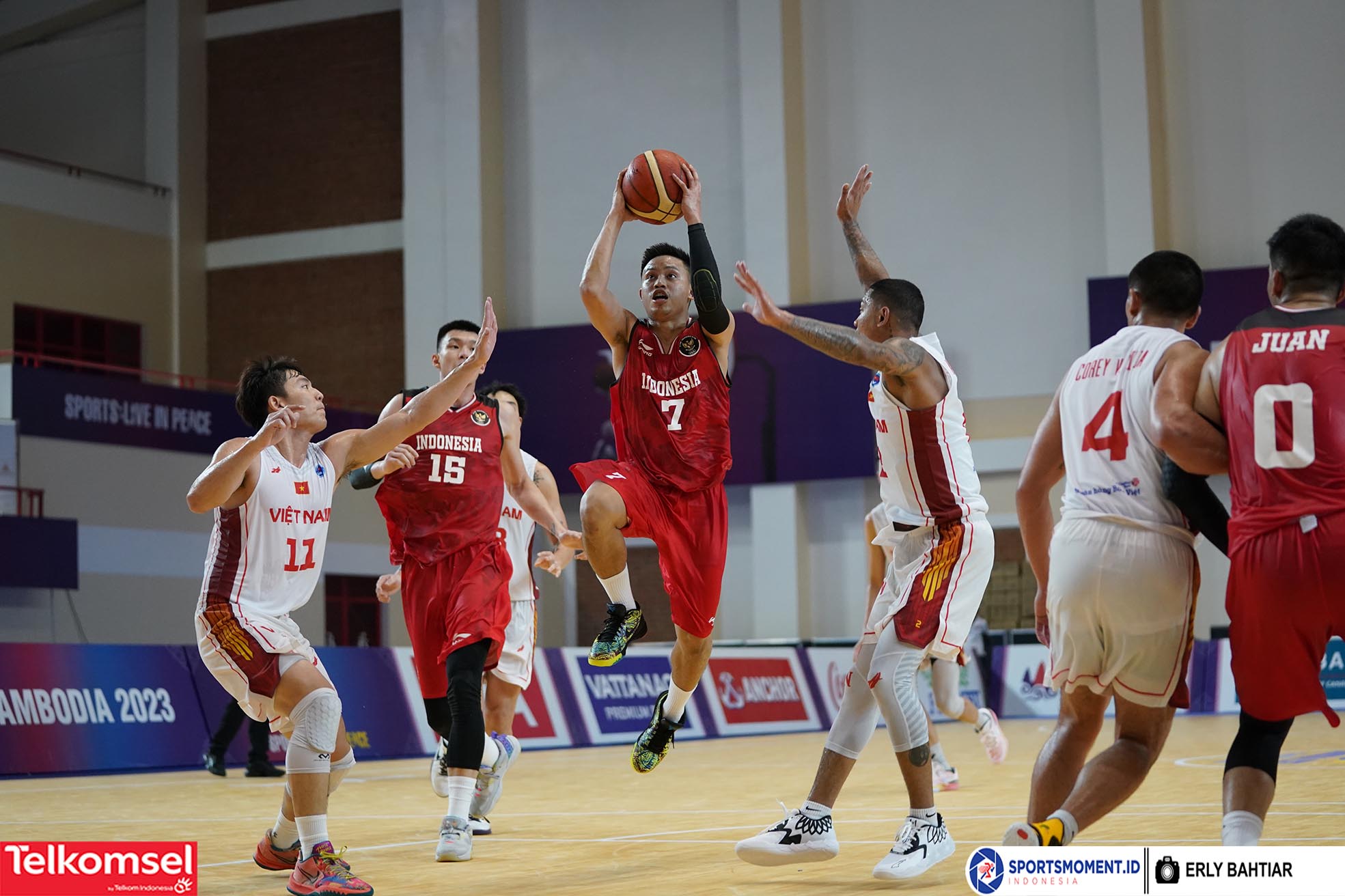Aksi pebasket putra Indonesia, Andakara Prastawa Dhyaksa (7) pada laga kedua SEA Games 2023 melawan tim basket putra Vietnam di Morodok Techo National Stadium, Jum’at (12/5). Indonesia menang 88-82 atas Vietnam. (Foto : sportsmoment.id/Erly Bahtiar)