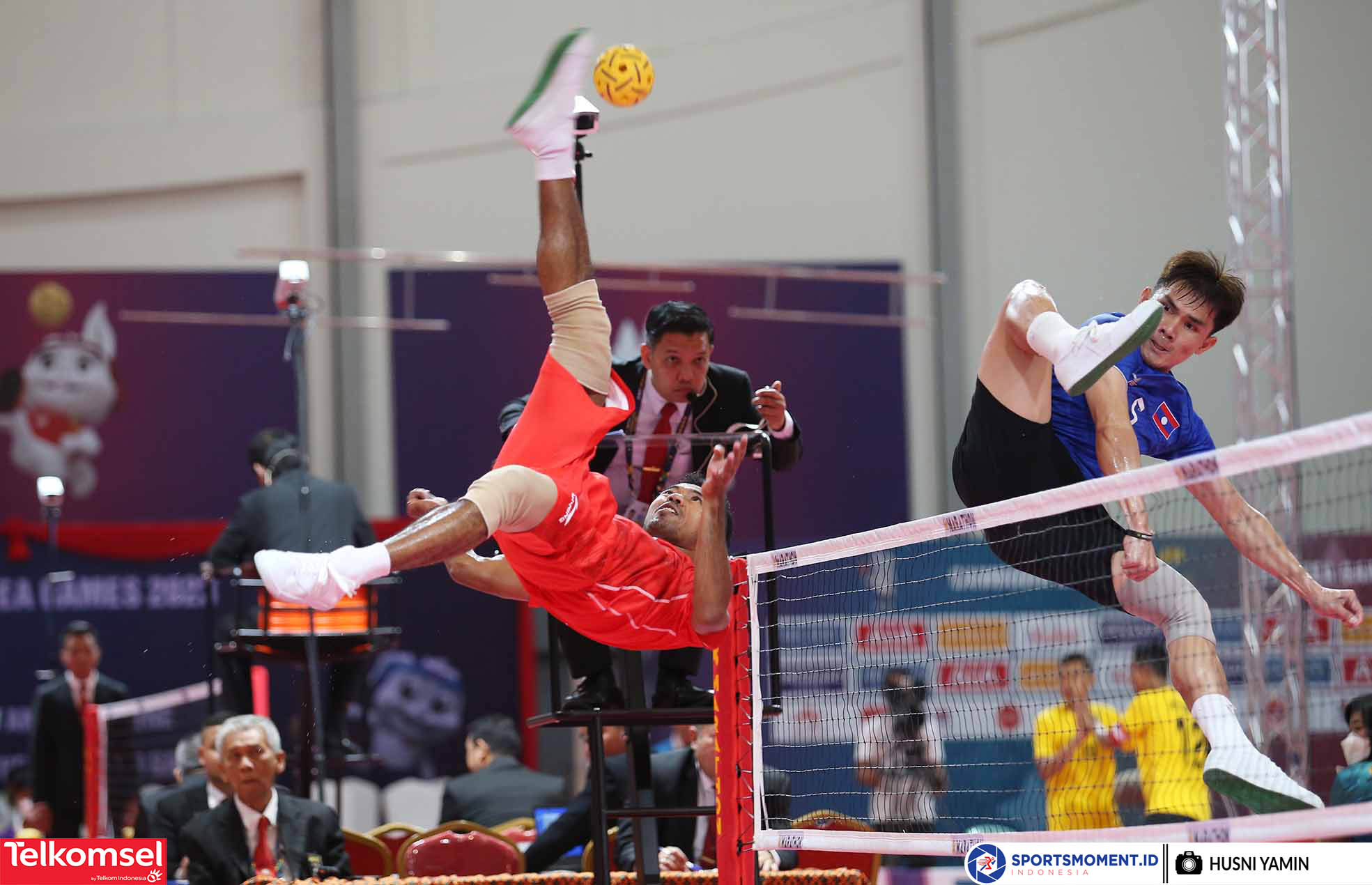 Pemain Sepak Takraw Indonesia, Saiful Rijal melancarkan serangan ke tim Laos dalam semifinal cabang Sepak Takraw Sea Games 2023 Kamboja di National Olympic Stadium, Basketball Hall NSTC, Phnom Penh (13/5/2023). (Sportsmoment.id/Husni Yamin)
