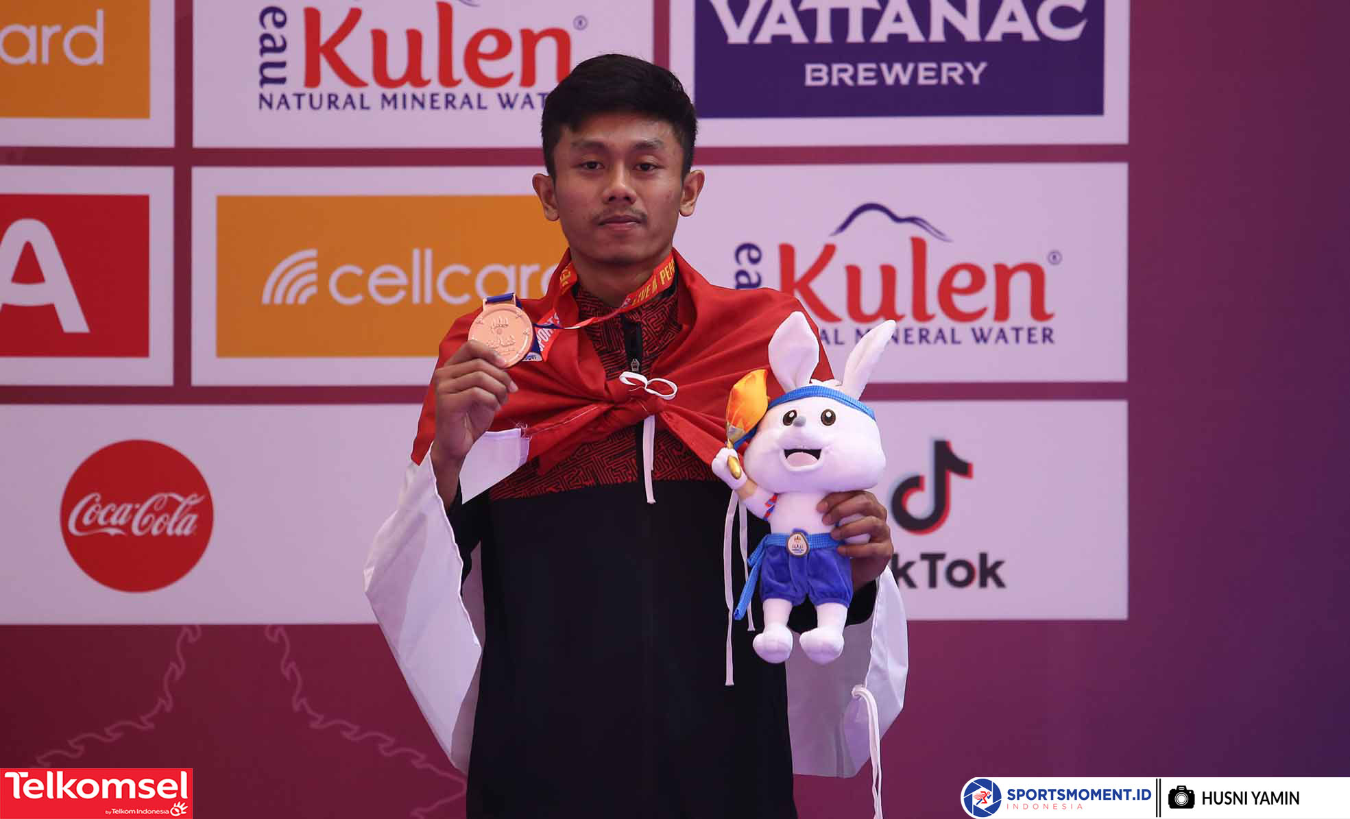 Taekwondoin Indonesia, Adam Yasid Ferdiansyah merebut medali Perunggu di nomor Kyorugi 68 KG Sea Games 2023 Kamboja di Chory Changvar International Convention Center, Phnom Penh (13/5/2023) (Sportsmoment.id/Husni Yamin)
