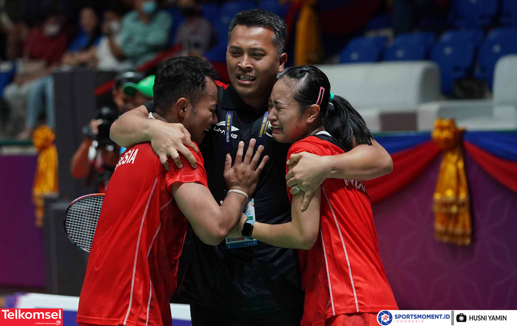 Pasangan Ganda Campuran Indonesia, Rehan Naufal Kusharjanto/Lisa Ayu Kusumawati berhasil meraih medali emas setelah di final mengalahkan pasangan Malaysia, Roy King Yap / Cheng Su Yin melalui pertarungan tiga gim 20-22, 21-8 dan 21-16 pada gelaran SEA Games 2023 Kamboja, di Morodok Techo Stadium, Badmintom Hall, Phnom Penh, Selasa (16/5/2023). (Foto : sportsmoment.id/Husni Yamin)