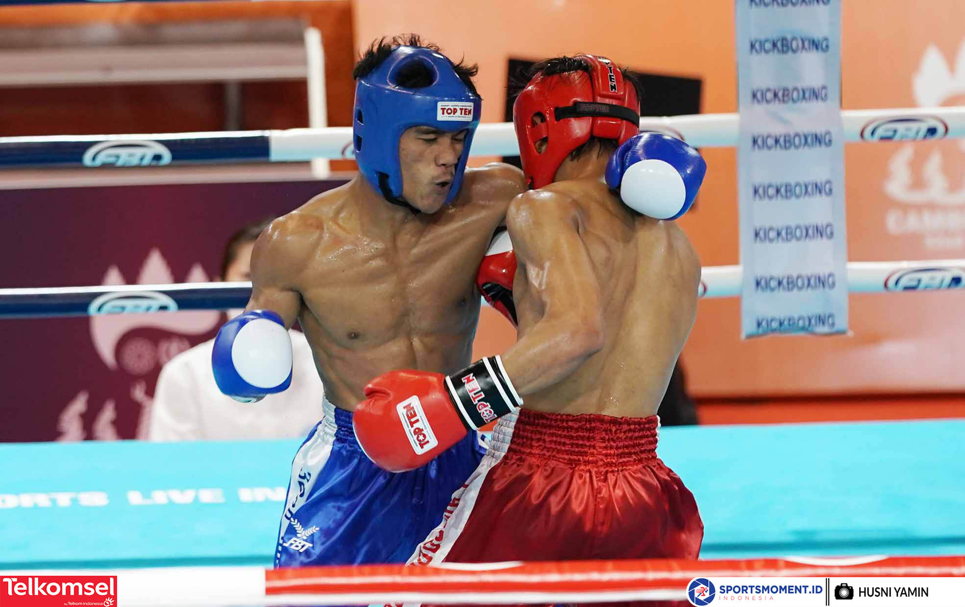 Atlet Kickboxing Indonesia, Toni Kristian Hutapea berhasil meraih medali emas di kelas Men’s Full Contact 54 Kg setelah difinal mengalahkan pemain Thailand pada gelaran SEA Games 2023 Kamboja di Morodok Techo Stadium, Elephant Hall 1 Phnom Penh, Selasa (16/5/2023). (Foto : sportsmoment.id/Husni Yamin)