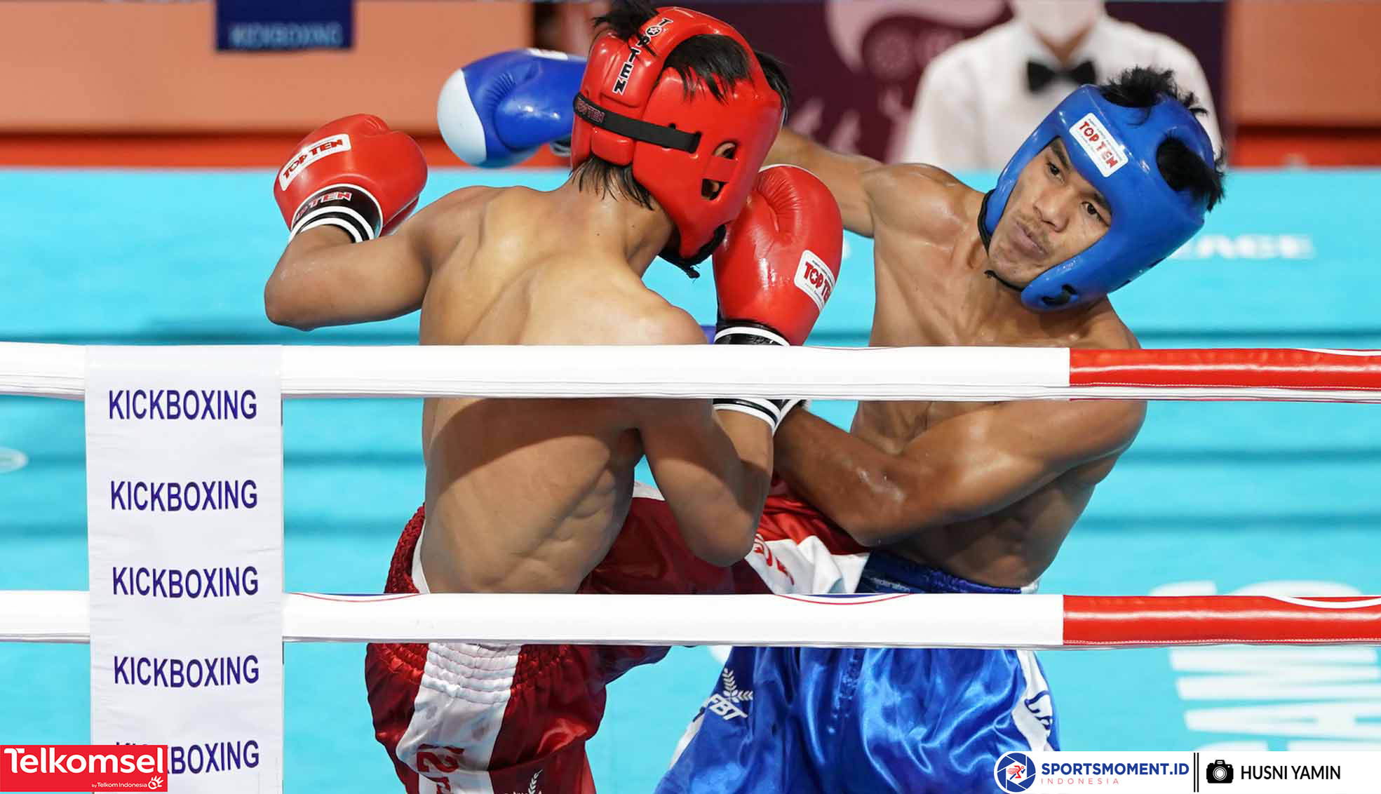 Atlet Kickboxing Indonesia, Toni Kristian Hutapea berhasil meraih medali emas di kelas Men’s Full Contact 54 Kg setelah difinal mengalahkan pemain Thailand pada gelaran SEA Games 2023 Kamboja di Morodok Techo Stadium, Elephant Hall 1 Phnom Penh, Selasa (16/5/2023). (Foto : sportsmoment.id/Husni Yamin)