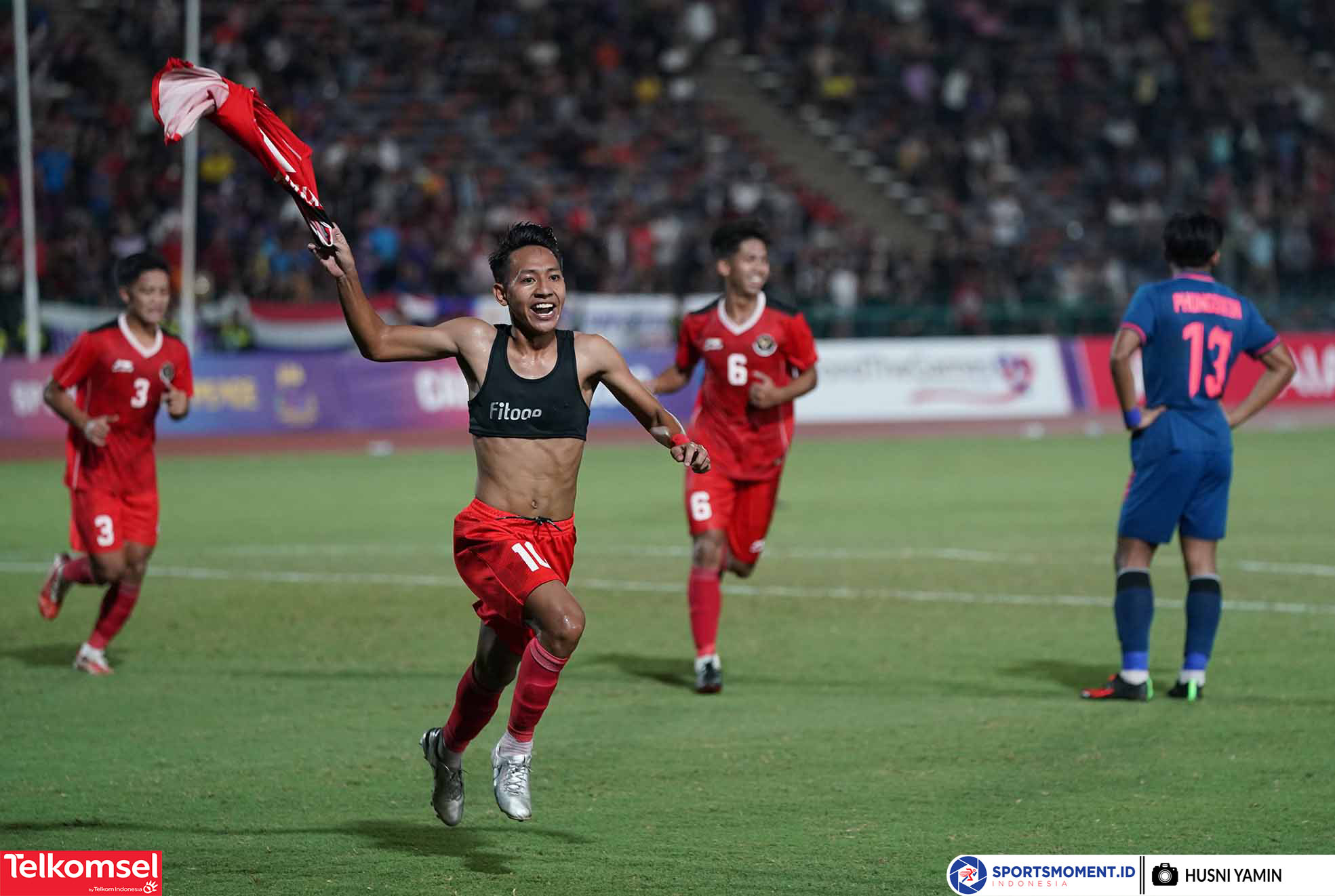 Pesepakbola Indonesia, Beckham Putra Nugraha selebrasi setelah mencetak gol kelima ke gawang Thailand pada gelaran SEA Games 2023 Kamboja di Olympic Stadium, Phnom Penh, Selasa (16/5/2023). Indonesia meraih medali Emas setelah mengalahkan Thailand 5-2. (Foto: sportsmoment.id/Husni Yamin).