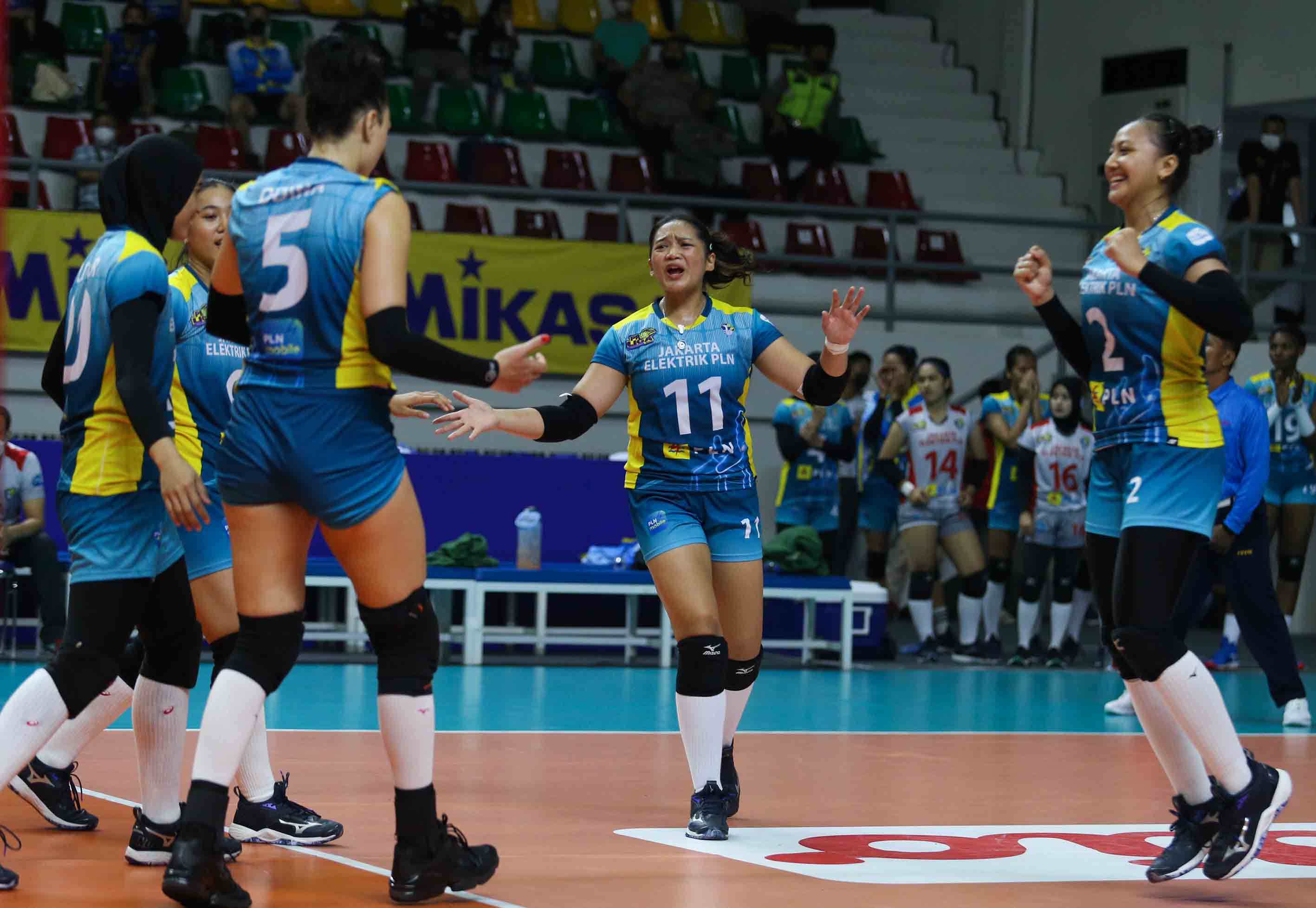 Tiara Ariance Ratna Sanger (11) pemain bola voli putri Jakarta Elektrik PLN meluapkan emosi kegembiraan setelah berhasil mendapatkan poin. Jakarta Elektrik PLN kalah atas Bandung BJB Tandamata dengan skor 2-3. Pertandingan Proliga 2022 putaran pertama yang berlangsung di GOR Padepokan Voli Jenderal Polisi Kunarto, Sentul, Jum’at (18/2/2022). (Foto : Erly Bahtiar/Sportsmoment.id)