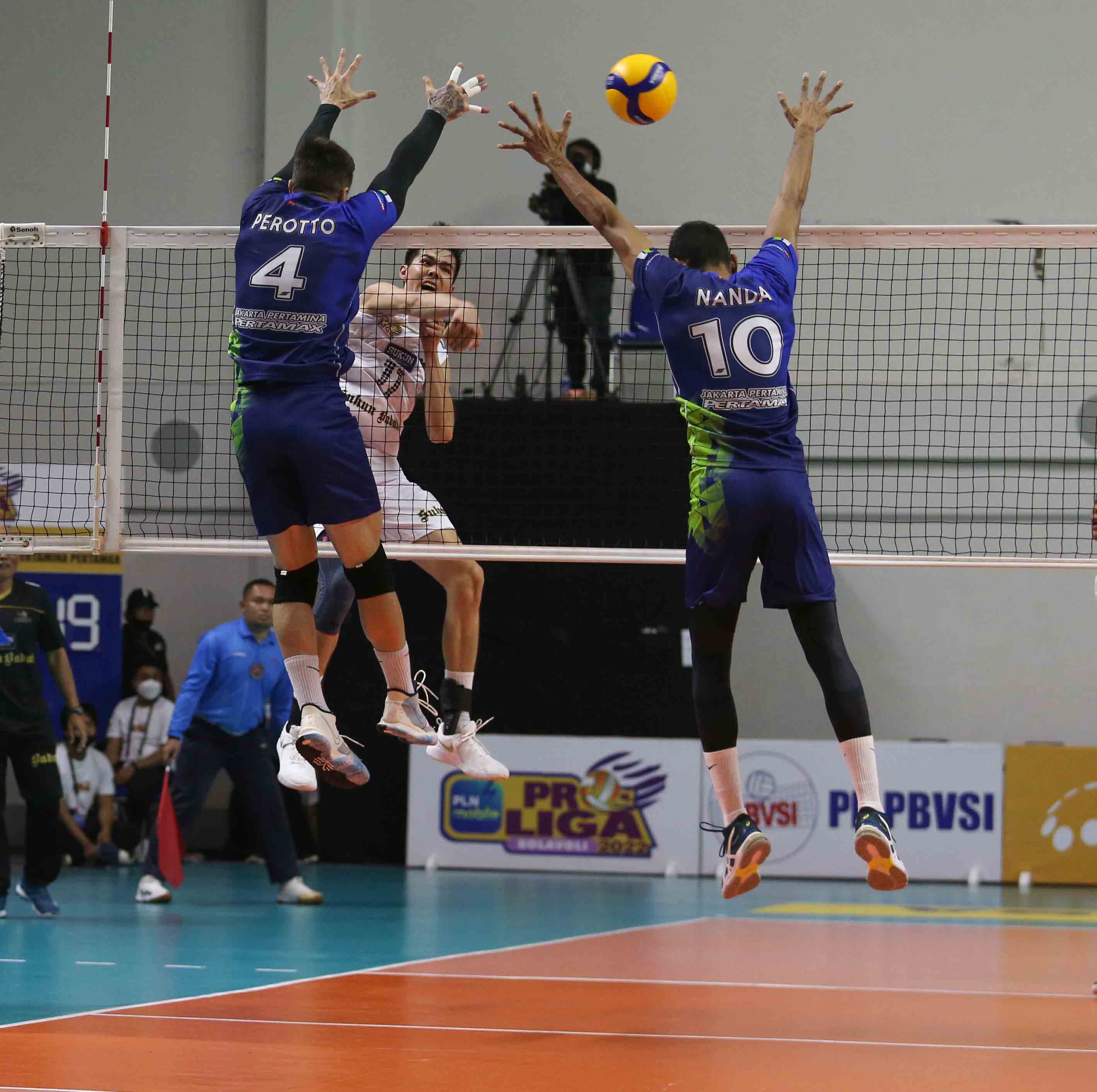 Islomjon Sobirov (11) pemain bola voli Kudus Sukun Badak mengarahkan pukulan smashnya ke area lawan. Kudus Sukun Badak berhasil menang dari tim bola voli putra Jakarta Pertamina Pertamax dengan skor 3-0 (25-23, 25-20, 25-22) pada Pertandingan Proliga 2022 putaran pertama yang berlangsung di GOR Padepokan Voli Jenderal Polisi Kunarto, Sentul, Jum’at (21/1/2022). (Foto : Erly Bahtiar/Sportsmoment.id)