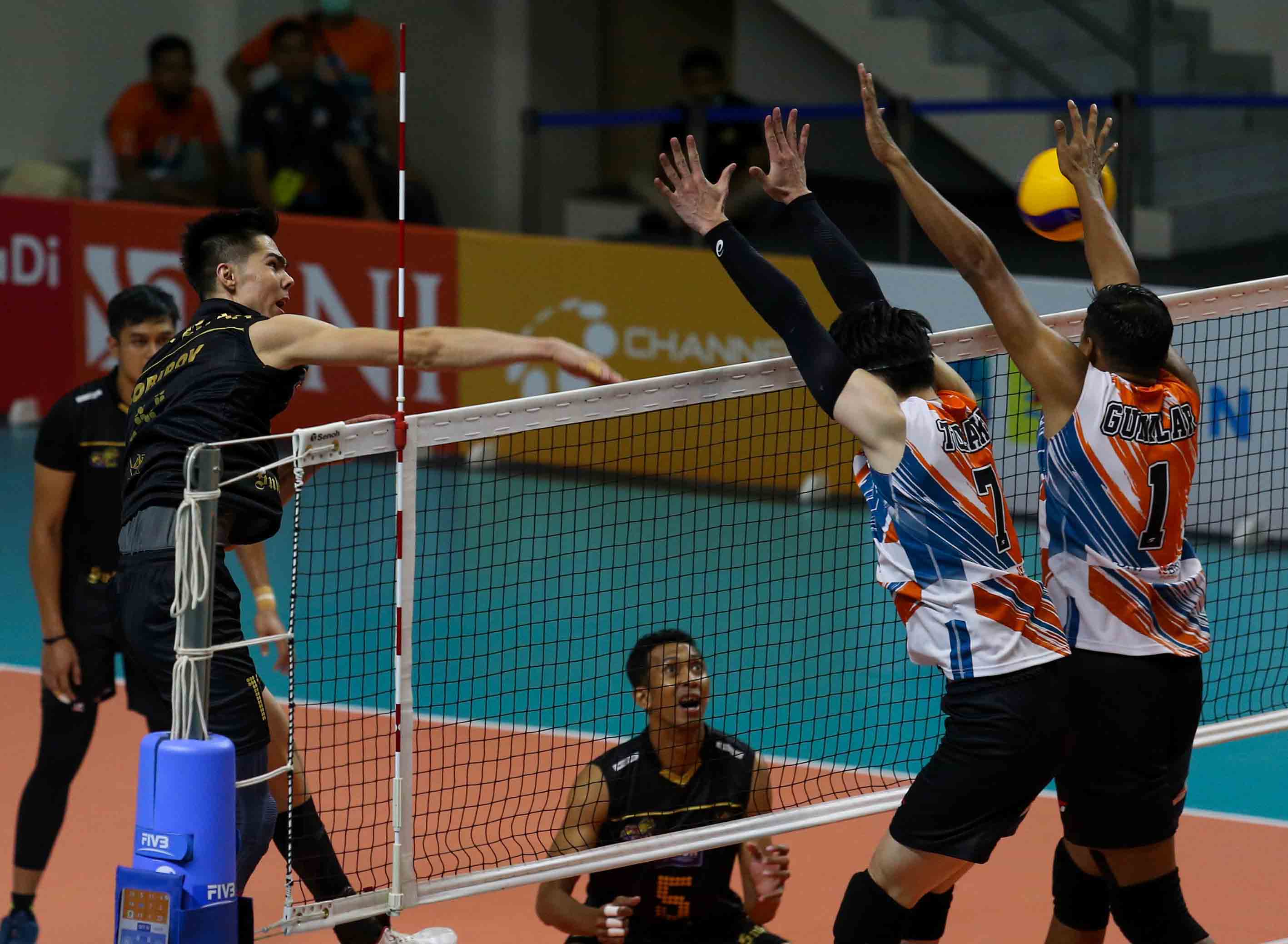 Islomjon Sobirov (11) pemain bola voli Kudus Sukun Badak mengarahkan pukulan smashnya ke area lawan. Kudus Sukun Badak harus mengakui keunggulan tim bola voli putra Jakarta BNI 46 dengan skor 2-3 (18-25, 25-20, 16-25, 25-23, 12-15) pada Pertandingan Proliga 2022 putaran pertama yang berlangsung di GOR Padepokan Voli Jenderal Polisi Kunarto, Sentul, Jum’at (28/1/2022). (Foto : Erly Bahtiar/Sportsmoment.id)