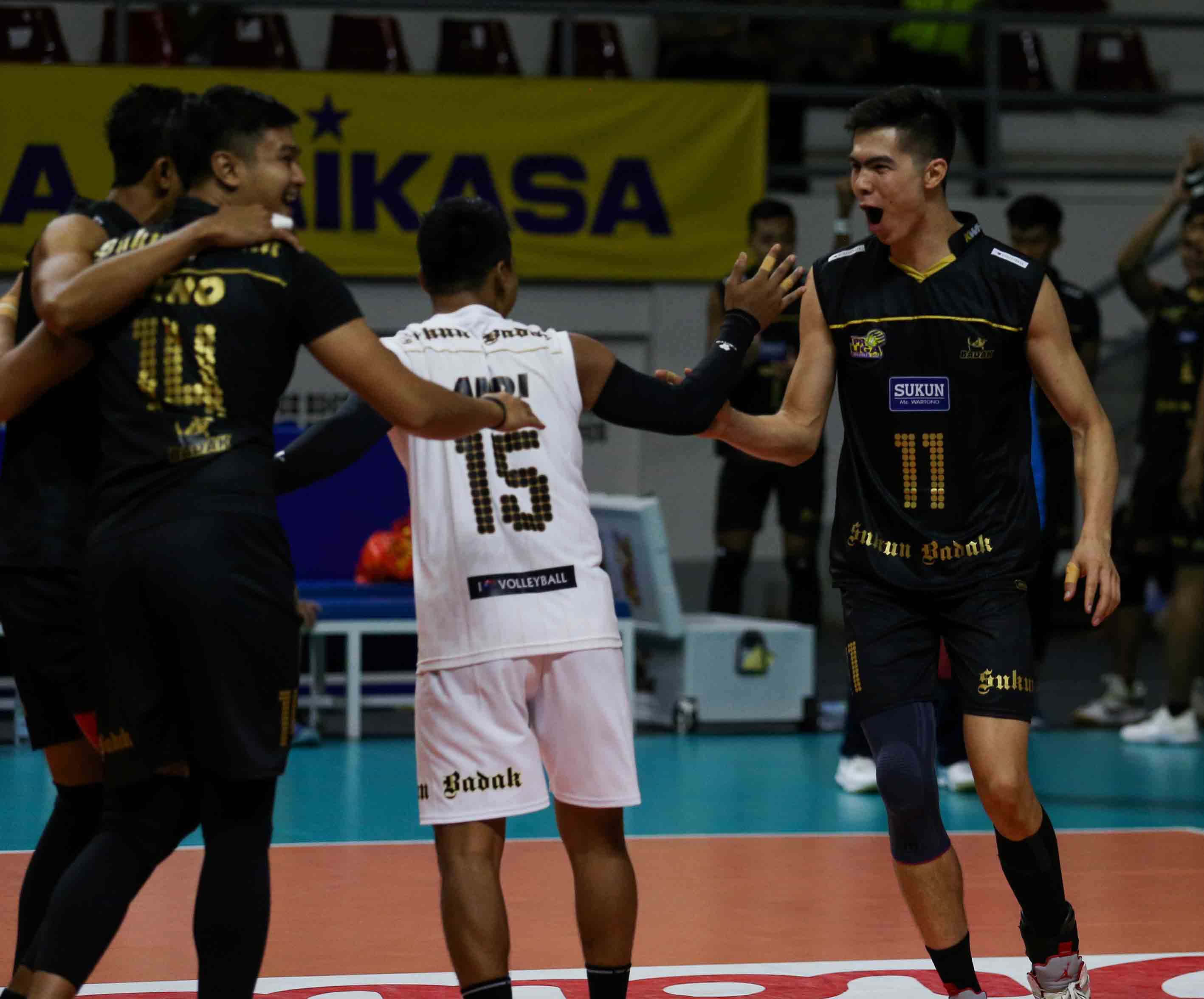 Islomjon Sobirov (11) pemain bola voli Kudus Sukun Badak meluapkan emosi kegembiraan setelah berhasil meraih poin. Kudus Sukun Badak harus mengakui keunggulan tim bola voli putra Jakarta BNI 46 dengan skor 2-3 (18-25, 25-20, 16-25, 25-23, 12-15) pada Pertandingan Proliga 2022 putaran pertama yang berlangsung di GOR Padepokan Voli Jenderal Polisi Kunarto, Sentul, Jum’at (28/1/2022). (Foto : Erly Bahtiar/Sportsmoment.id)