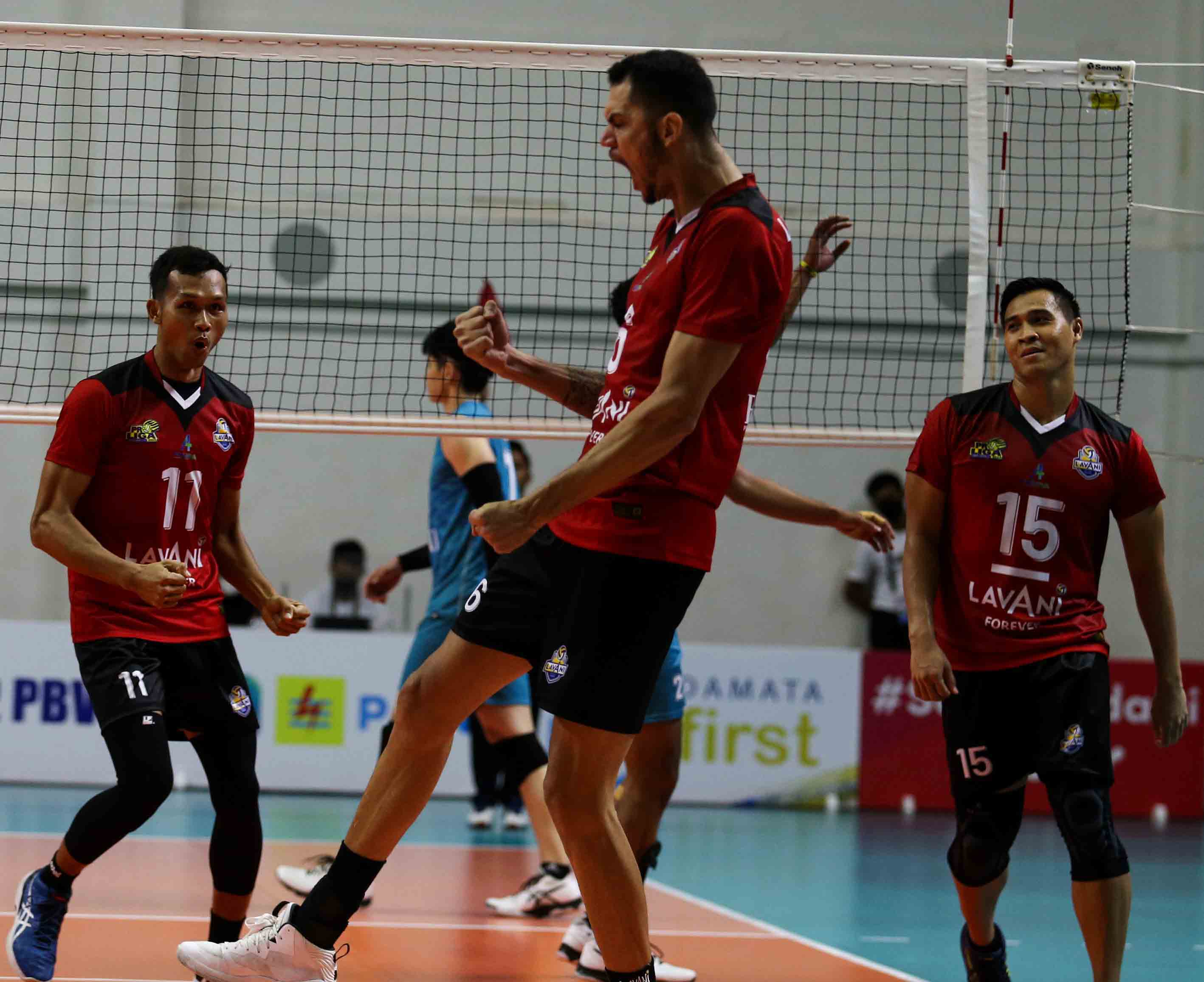 Leandro Martinus Da Silva (6) pemain bola voli Bogor Lavani meluapkan emosi kegembiraan setelah berhasil meraih poin. Bogor Lavani berhasil menang dari tim bola voli putra Jakarta BNI 46 dengan skor 3-1 (25-17, 21-25, 25-15, 25-16) pada Pertandingan Proliga 2022 putaran pertama yang berlangsung di GOR Padepokan Voli Jenderal Polisi Kunarto, Sentul, Minggu (23/1/2022). (Foto : Erly Bahtiar/Sportsmoment.id),