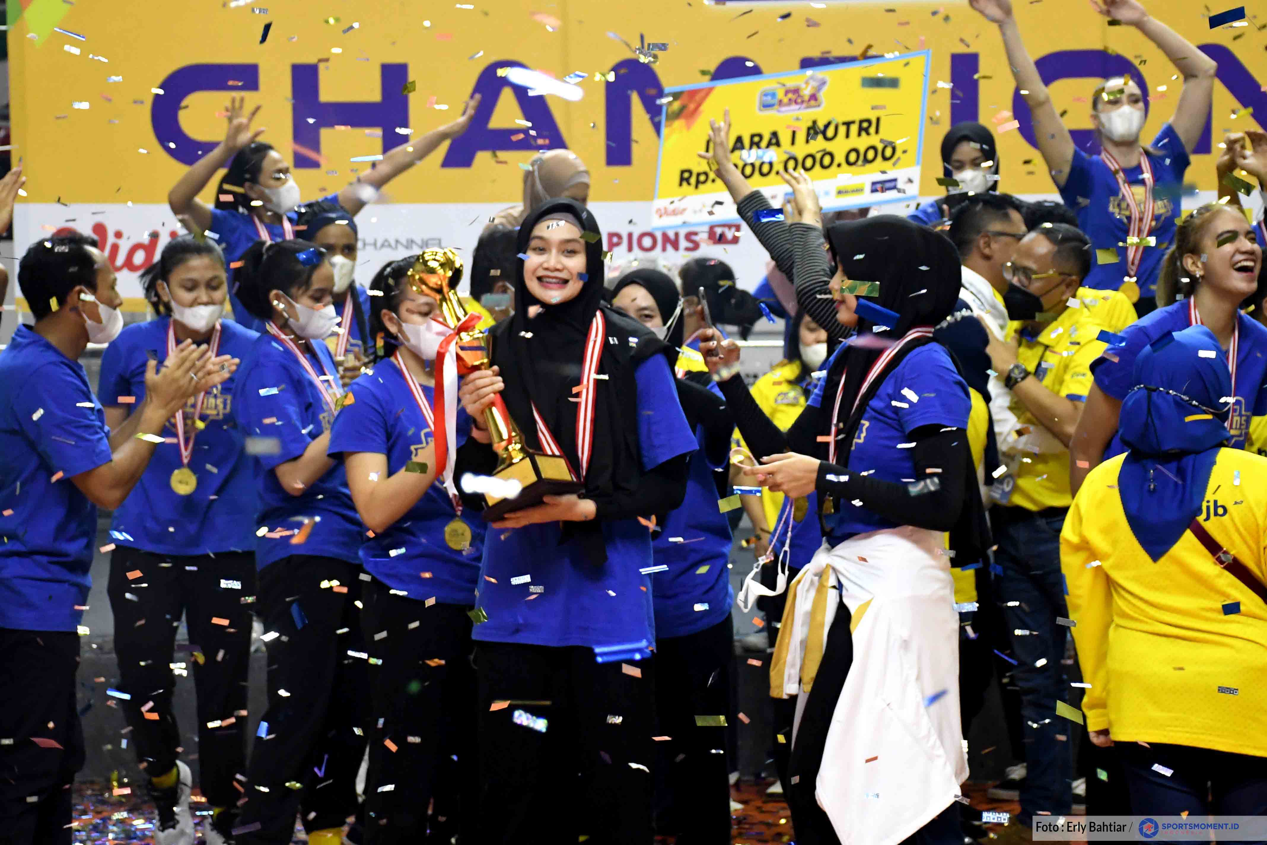 Tim putri Bandung Bank BJB Tandamata menjadi juara PLN Mobile Proliga 2022 usai mengalahkan Gresik Petrokimia Pupuk Indonesia (GPP) di GOR Padepokan Voli Jenderal Polisi Kunarto, Sentul, Bogor, Sabtu (26/3/2022), Bandung BJB Tandamata menang dengan skor 3-1 (25-17, 25-19, 22-25, 25-18) atas GPP. (Foto : Erly Bahtiar/sportsmoment.id),,